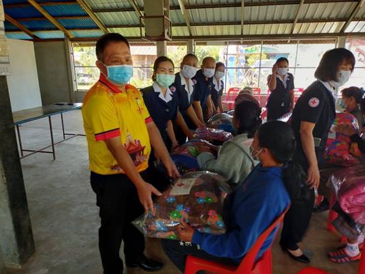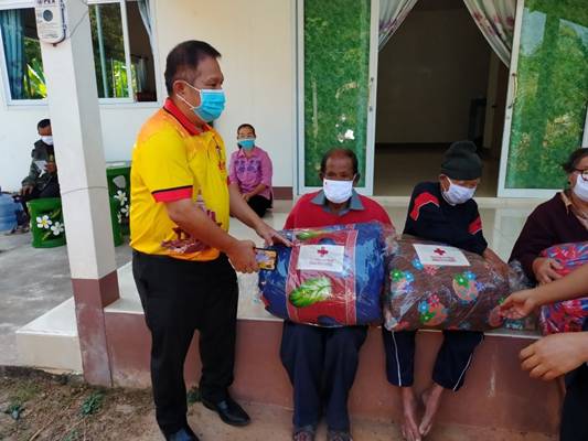 โดยได้มอบถุงยังชีพ จำนวน 1 ชุด น้ำดื่ม จำนวน 1 แพ็ค ไข่ไก่ 1 แผง สเปรย์แอลกอฮอล์ ขนาด 100 ML จำนวน 1 ขวด และหน้ากากอนามัย จำนวน 2 ชิ้น ให้แก่ผู้ยากไร้และครอบครัวดังกล่าว