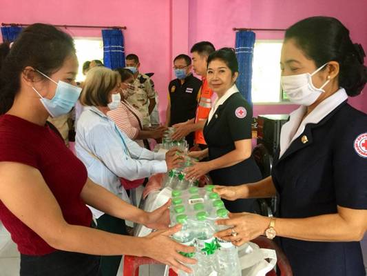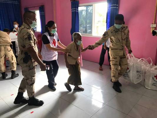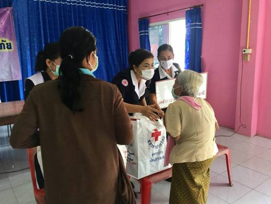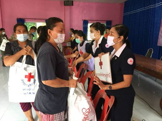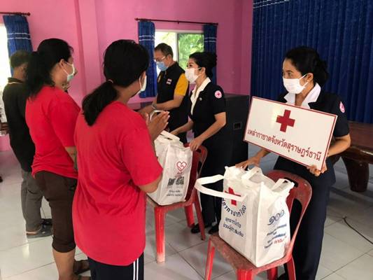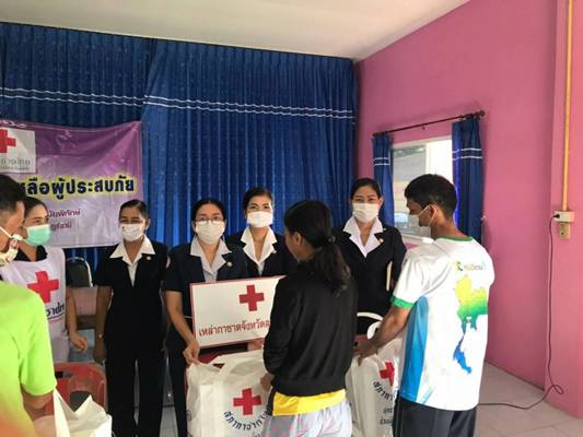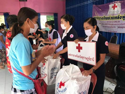 วันที่ 10 ธันวาคม 2563 นางอุรสา จินโต นายกเหล่ากาชาดจังหวัดสุราษฎร์ธานี พร้อมด้วยนางราตรี รัตนสุภา รองนายกเหล่ากาชาดจังหวัดฯนางสินีลักษณ์ จิรสัตย์สุนทร กรรมการเหล่ากาชาดจังหวัดฯและสมาชิกเหล่ากาชาดจังหวัดสุราษฎร์ธานีนางฐานิกา พรหมประสงค์ หัวหน้าสถานีกาชาดสิรินธร (สถานีกาชาดที่ 12 ทุ่งสง)นายวิโรจน์ เดชเกลี้ยง นายอำเภอวิภาวดีปลัดอำเภอหัวหน้ากลุ่มงานบริหารงานปกครองกำนัน ผู้ใหญ่บ้านและ อสม. ร่วมลงพื้นที่อำเภอวิภาวดีเพื่อมอบชุดถุงธารน้ำใจ และน้ำดื่ม ที่ได้รับการสนับสนุนจากสำนักงานบรรเทาทุกข์และประชานามัยพิทักษ์ สภากาชาดไทยให้กับผู้ประสบอุทกภัย ในพื้นที่ หมู่ที่ 1 ตำบลตะกุกเหนืออำเภอวิภาวดี จังหวัดสุราษฎร์ธานี จำนวน 306 ชุด ณ ศูนย์เรียนรู้เศรษฐกิจพอเพียงบ้านท่านหญิง เพื่อเป็นขวัญกำลังใจและบรรเทาทุกข์ในเบื้องต้น