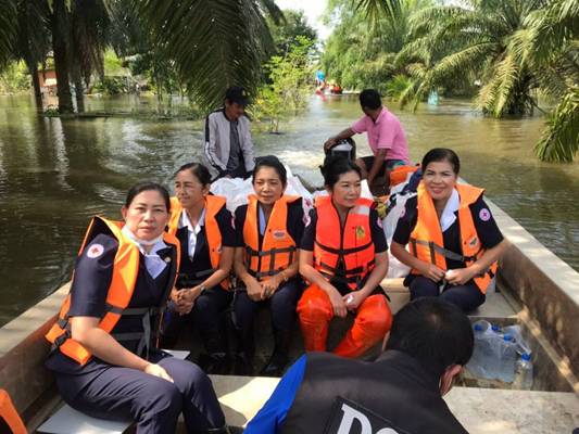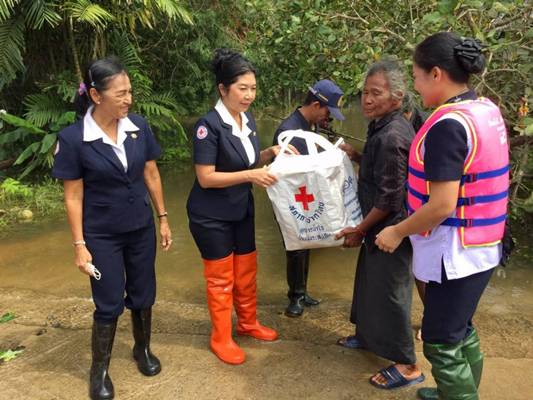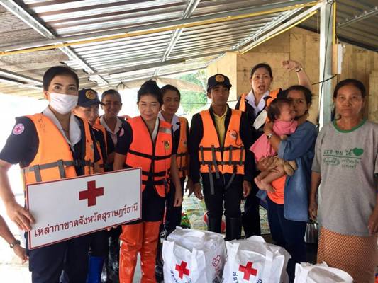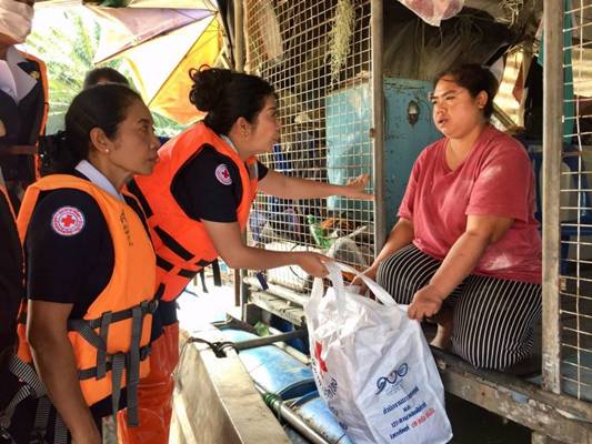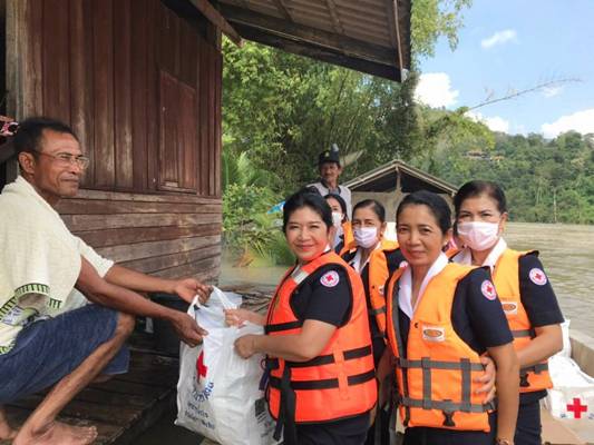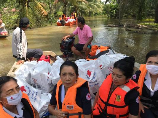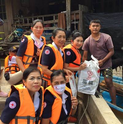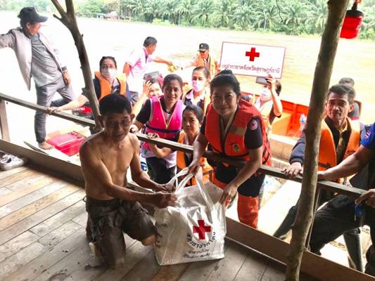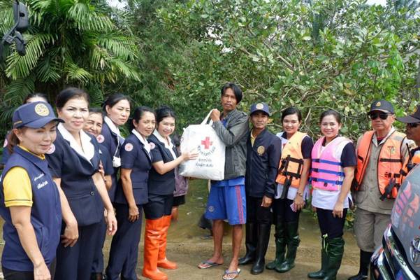 และน้ำดื่ม ที่ได้รับการสนับสนุนจากสำนักงานบรรเทาทุกข์และประชานามัยพิทักษ์ สภากาชาดไทยให้กับผู้ประสบอุทกภัย ในพื้นที่อำเภอพุนพิน จำนวน 200 ชุด เพื่อเป็นขวัญกำลังใจและบรรเทาทุกข์ในเบื้องต้น