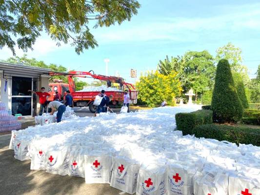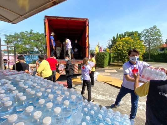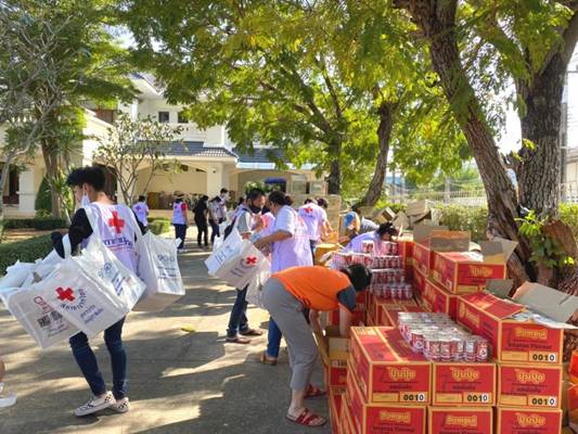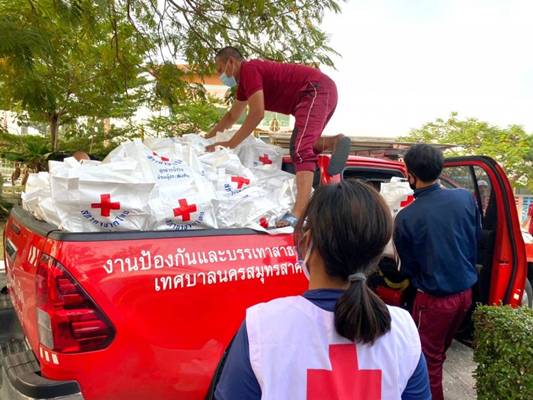 วันที่ 20 ธันวาคม 2563 เวลา 10.30 น. นางชุติพร วิจิตร์แสงศรี นายกเหล่ากาชาดจังหวัดสมุทรสาคร พร้อมรองนายกฯ กรรมการ และสมาชิกเหล่ากาชาดฯ ร่วมกับอำเภอเมืองสมุทรสาคร สำนักงานพัฒนาชุมชนจังหวัดฯ ชมรมYEC สมุทรสาคร เทศบาลนครสมุทรสาคร และปกครองจังหวัดฯ รวมพลังบรรจุชุดธารน้ำใจ รวมพลังบรรจุถุงธารน้ำใจ ชุด COVID-19 จำนวน 1,000 ชุด จากสำนักงานบรรเทาทุกข์ ฯ สภากาชาดไทย เพื่อแจกจ่ายให้กลุ่มแรงงานต่างด้าวผู้เสี่ยงติดเชื้อและแพร่เชื้อ ซึ่งถูกกักตัวและปิดล้อมเป็นเขตอันตรายเสี่ยงโรคติดเชื้อไวรัส COVID-19 ในบริเวณตลาดกุ้งกลาง โดยถุงธารน้ำใจดังกล่าว สามารถยังชีพอยู่ได้ 4 วัน/1 ครอบครัว/1 ถุง และจะร่วมจัดชุดธารน้ำใจส่งให้อีกครั้ง ในวันพุธที่ 23 ธันวาคม 2563 เพื่อป้องกันไม่ให้แรงงานต่างด้าวปะปนแพร่เชื้อ กระจายความเสี่ยงเพิ่มมากขึ้น