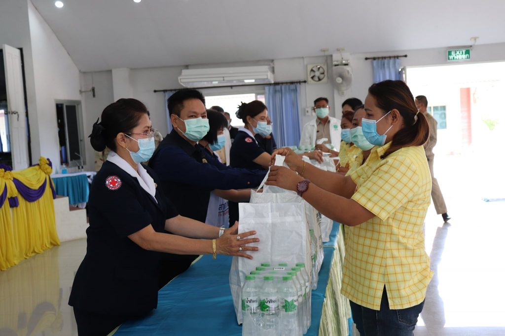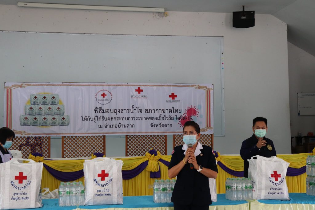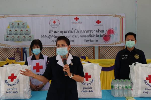 วันที่ 25 มกราคม 2564 นางศลิษา ภิรมย์รัตน์ นายกเหล่ากาชาดจังหวัดตาก พร้อมด้วย นางพิกุล สุวรรณ์จันทร์รัสมี รองนายกเหล่ากาชาดจังหวัดตาก ร่วมมอบชุดธารน้ำใจกู้ชีวิตฝ่าวิกฤติโควิด-19 ให้กับผู้ได้รับผลกระทบจากการระบาดของเชื้อไวรัสโควิด-19 จำนวน 25 ราย ณ ห้องประชุมองค์การบริหารส่วนตำบลแม่สลิด ตำบลแม่สลิด อำเภอบ้านตาก โดยมี นายอรรถวุฒิ พึ่งเนียม นายอำเภอบ้านตาก นางสาวนฤมล พรมวา หัวหน้าสถานีกาชาดเทพรัตน์ (สถานีกาชาดที่ 13 จังหวัดตาก) หัวหน้าส่วนราชการประจำอำเภอ กรรมการ/สมาชิกกิ่งกาชาดอำเภอบ้านตาก นายกอบต. กำนัน ผู้ใหญ่บ้าน และประชาชนในพื้นที่ ร่วมพิธีฯ และให้การต้อนรับ ในการนี้เหล่ากาชาดจังหวัดตาก ได้รับข้อมูลของผู้ได้รับผลกระทบจากการระบาดของเชื้อไวรัสโควิด–19 ผ่านทางแอพพลิเคชั่น “พ้นภัย” โดยมี แกนนำ อสม.ประจำหมู่บ้าน เป็นผู้สำรวจและลงข้อมูล
