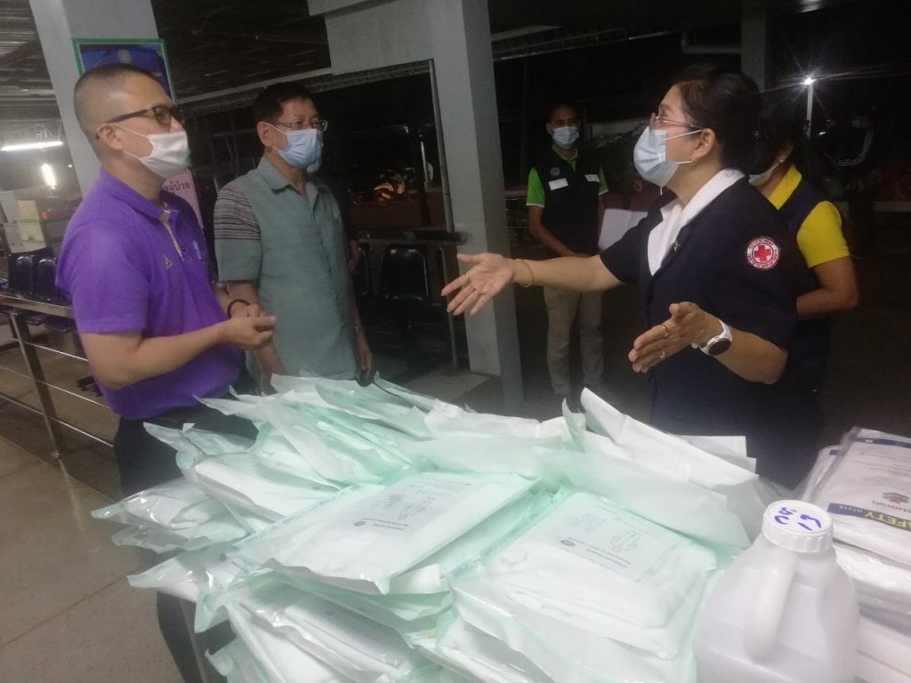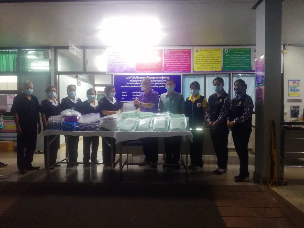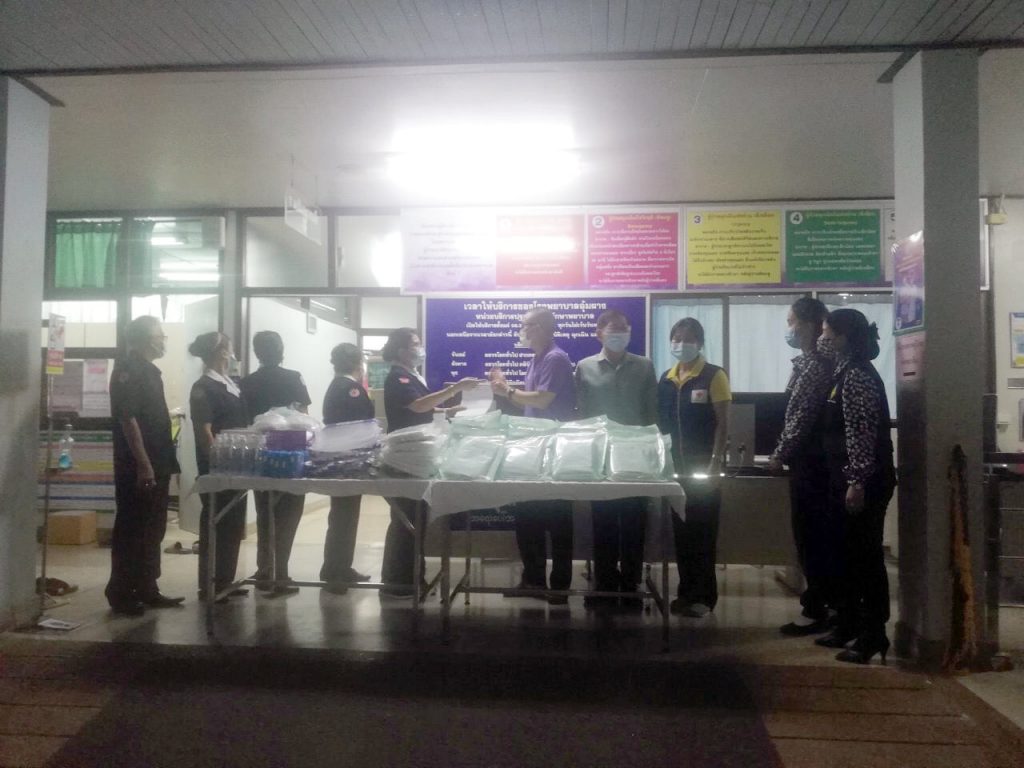โดยครั้งนี้ เหล่ากาชาดจังหวัดตาก และคณะฯ ได้นำอุปกรณ์ทางการแพทย์และสิ่งของจำเป็นในการป้องกันโควิด-19 มอบให้แก่โรงพยาบาลอุ้มผาง ประกอบด้วย หน้ากากอนามัย N95 จำนวน 100 ชิ้น , Face Chield จำนวน 50 ชิ้น , ถุงคลุมรองเท้าแบบใช้แล้วทิ้ง (Disposable Shoe Cover) จำนวน 50 คู่ , ถุงมือตรวจโรค (Examination gloves) จำนวน 1,200 ชิ้น , เสื้อกาวน์ใช้แล้วทิ้ง (Disp.Isolation coverall sterile) จำนวน 50 ชุด , เสื้อกาวน์ Disp.Isolation coverall non-sterile จำนวน 10 ชุด , แอลกอฮอล์เจล ขนาด 450 ml. จำนวน 8 ขวด ,แอลกอฮอล์เจล ขนาด 5,000 ml. จำนวน 1 แกลลอน และหน้ากากอนามัย (Surgical mask) จำนวน 500 ชิ้น เพื่อให้นำไปใช้ในการปฏิบัติของเจ้าหน้าที่และบุคลากรโรงพยาบาลอุ้มผาง ในการป้องกันและควบคุมการแพร่ระบาดของโรคติดเชื้อไวรัสโควิด-19 ต่อไป