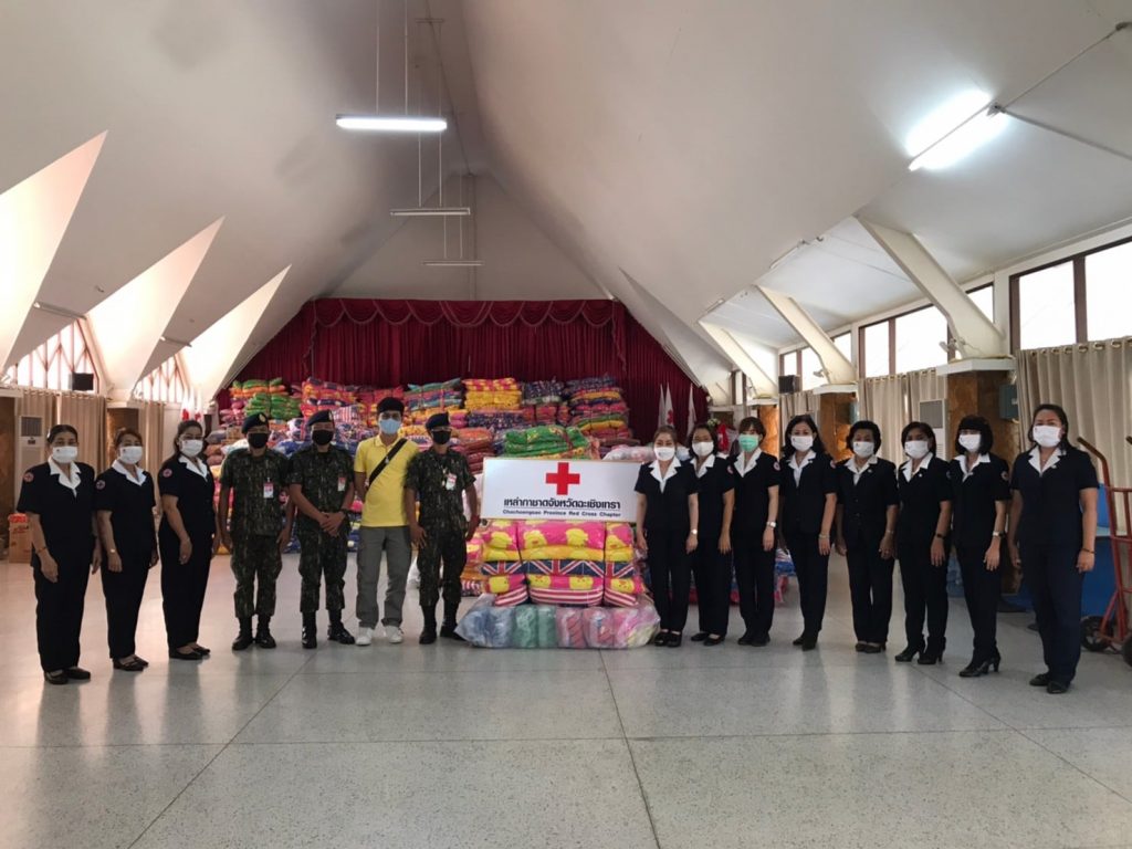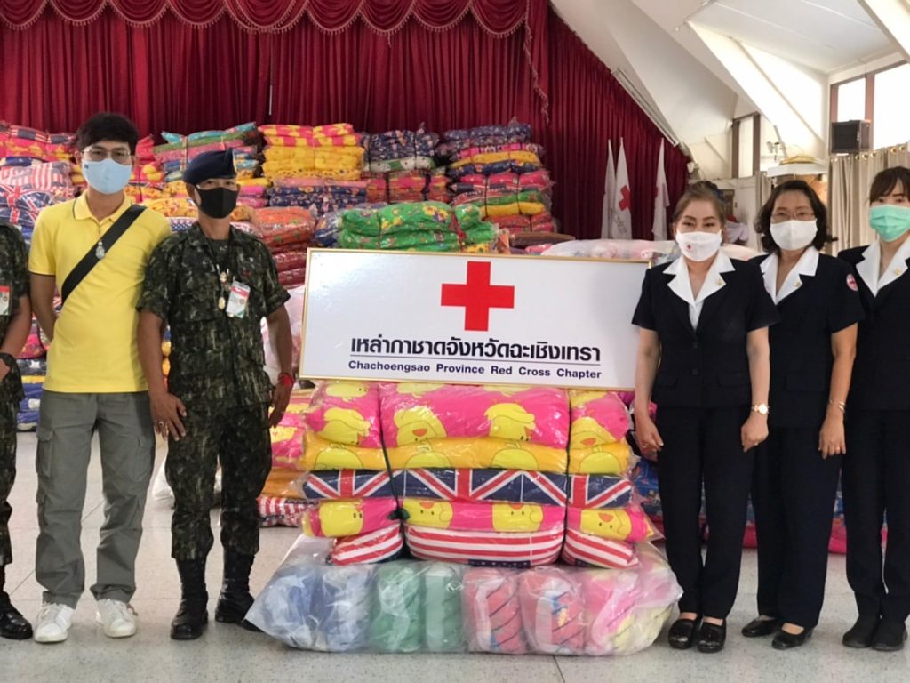 วันที่ 5 กุมภาพันธ์ 2564 นางจันทรรัตน์ ไตรติลานันท์ นายกเหล่ากาชาดจังหวัดฉะเชิงเทรา นางจันทิรา แก้วกุลปรีชา รองนายกเหล่ากาชาดจังหวัดฉะเชิงเทรา พร้อมด้วยคณะกรรมการเหล่ากาชาดจังหวัดฉะเชิงเทรา พิธีมอบผ้าห่ม ที่นอน และของใช้จำเป็นเบื้องต้น ให้แก่กิ่งอำเภบางปะกง และกิ่งอำเภอบางคล้า เพื่อนำไปใช้กิจกรรมบรรเทาทุกข์ผู้ประสบสาธารณภัย สำหรับผู้ยากไร้ ผู้สูงอายุต่อไป ณ สำนักงานเหล่ากาชาดจังหวัดฉะเชิงเทรา ตำบลหน้าเมือง อำเภอเมือง จังหวัดฉะเชิงเทรา