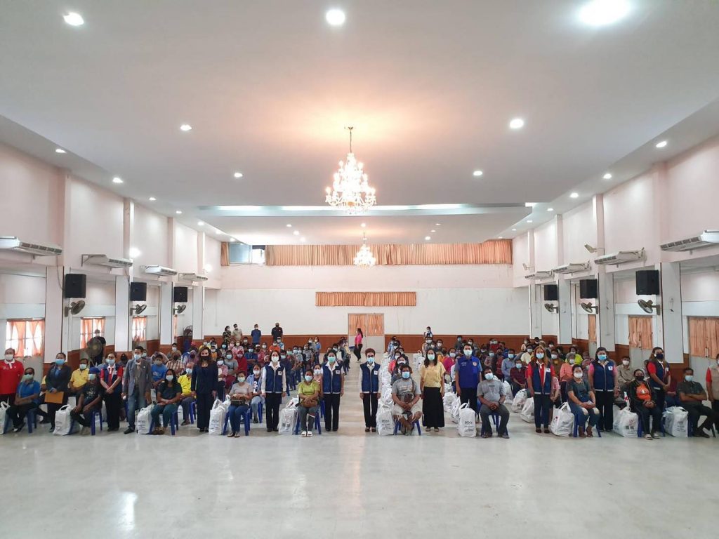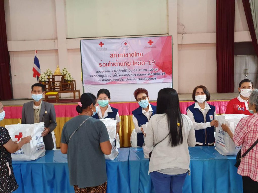 วันที่ 25 กุมภาพันธ์ 2564 แพทย์หญิง สุวรรณา ไชยชุมศักดิ์ นายกเหล่ากาชาดจังหวัดนนทบุรี นางจิตรา ธนเดชากุล รองนายกเหล่ากาชาดฯ นางพิกุล ผลบุญ ผู้ช่วยนายกเหล่ากาชาดฯ กรรมการและสมาชิกเหล่ากาชาดฯ พร้อมด้วย นายพิรุณ วิมลอักษร นายกกิ่งกาชาดอำเภอไทรน้อย ทีมกิ่งกาชาดอำเภอไทรน้อย ปลัดอำเภอ และกำนันผู้ใหญ่บ้าน ร่วมมอบชุดธารน้ำใจกู้ชีวิตผ่าวิกฤตโควิค -19 จำนวน 120 ชุด ให้แก่ผู้เปราะบางที่ได้รับผลกระทบจากสถานการณ์โรคติดเชื้อ Covid-19 ณ ศาลาประชาคมอำเภอไทรน้อย ตำบลไทรน้อย อำเภอไทรน้อย จังหวัดนนทบุรี