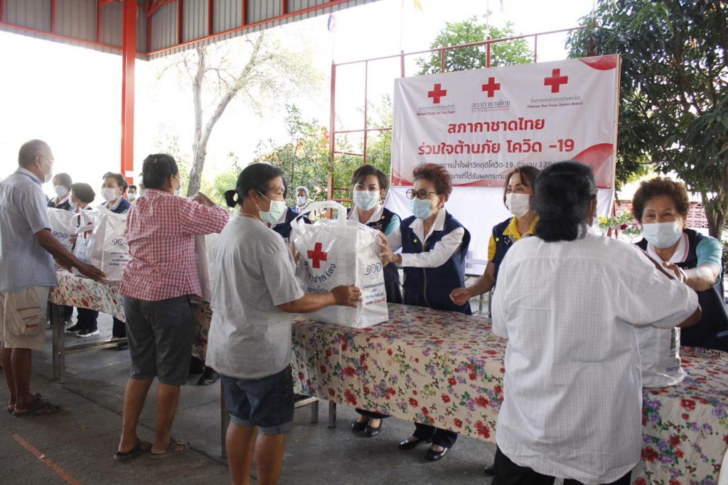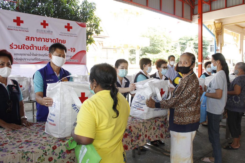 วันที่ 4 กุมภาพันธ์ 2564 แพทย์หญิง สุวรรณา ไชยชุมศักดิ์ นายกเหล่ากาชาดจังหวัดนนทบุรี นางจิตรา ธนเดชากุล รองนายกเหล่ากาชาดฯ นางพิกุล ผลบุญ ผู้ช่วยนายกเหล่ากาชาดฯ กรรมการและสมาชิกเหล่ากาชาดฯ พร้อมด้วย นายสมยศ วิชากร นายกกิ่งกาชาดอำเภอปากเกร็ด ทีมกิ่งกาชาดอำเภอปากเกร็ด นายสำเริง ปานปิ่น สาธารณสุขอำเภอปากเกร็ด ปลัดอำเภอ เสมียนตราอำเภอ และกำนันผู้ใหญ่บ้าน ร่วมมอบชุดธารน้ำใจกู้ชีวิตผ่าวิกฤตโควิค -19 จำนวน 120 ชุด ให้แก่ผู้เปราะบางที่ได้รับผลกระทบจากสถานการณ์โรคติดเชื้อ Covid-19 ณ ศาลาวัดสาลีโขภิตาราม ตำบลบางพลับ อำเภอปากเกร็ด จังหวัดนนทบุรี