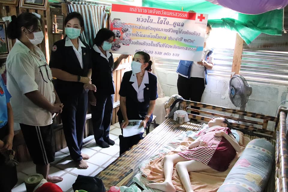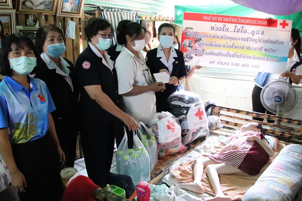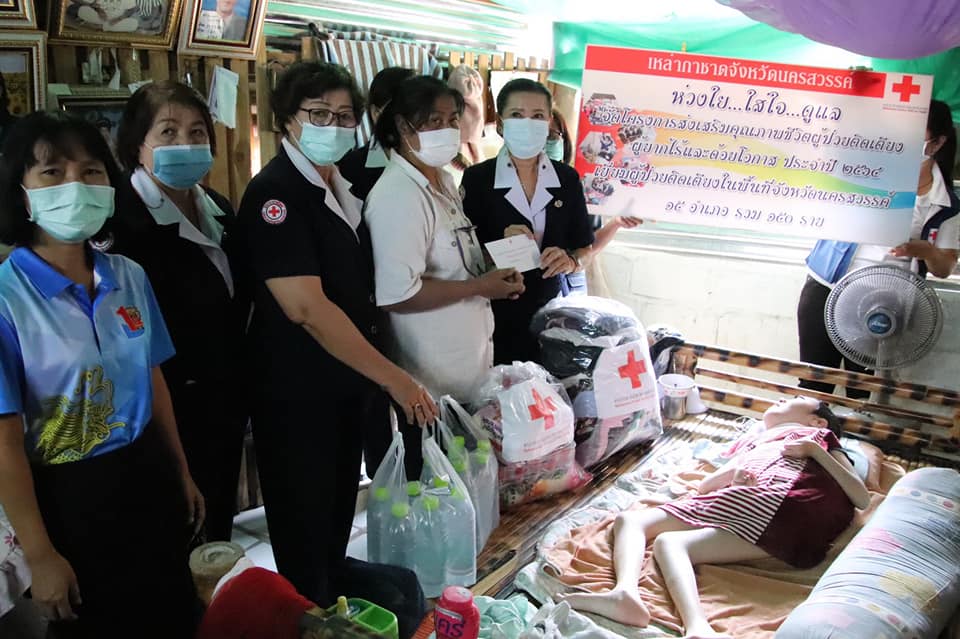 วันที่ 28 มกราคม 2564 นางสุกัญญา ชุมอุปการ นายกเหล่ากาชาดจังหวัดนครสวรรค์ ได้มอบหมายให้ นางนพปพัชร์ วรายนต์พินิจ ผู้ช่วยนายกเหล่ากาชาดจังหวัดนครสวรรค์ พร้อมด้วย คณะกรรมการ และสมาชิกเหล่ากาชาดจังหวัดนครสวรรค์ ร่วมกับ อำเภอไพศาลี พัฒนาสังคมและความมั่นคงของมนุษย์ จังหวัดนครสวรรค์ สาธารณสุขอำเภอไพศาลี อสม.ในพื้นที่ ลงพื้นที่เยี่ยมผู้ป่วยติดเตียงในโครงการ “ส่งเสริมสุขภาพชีวิตผู้ป่วยติดเตียง ผู้ยากไร้และด้อยโอกาส ประจำปี 2564” รายนางสาวรุ่งฟ้า บัวประทุม อายุ 23 ปี บ้านเลขที่ 314 หมู่ที่ 2 ตำบลวังข่อย อำเภอไพศาลี จังหวัดนครสวรรค์ โดยเหล่ากาชาดฯ มอบเงินสงเคราะห์ จำนวน 1,000 บาท พร้อมเครื่องอุปโภค บริโภค และน้ำดื่ม เพื่อเป็นการบรรเทาความเดือดร้อนในเบื้องต้น และให้กำลังใจในการเนินชีวิตต่อไป