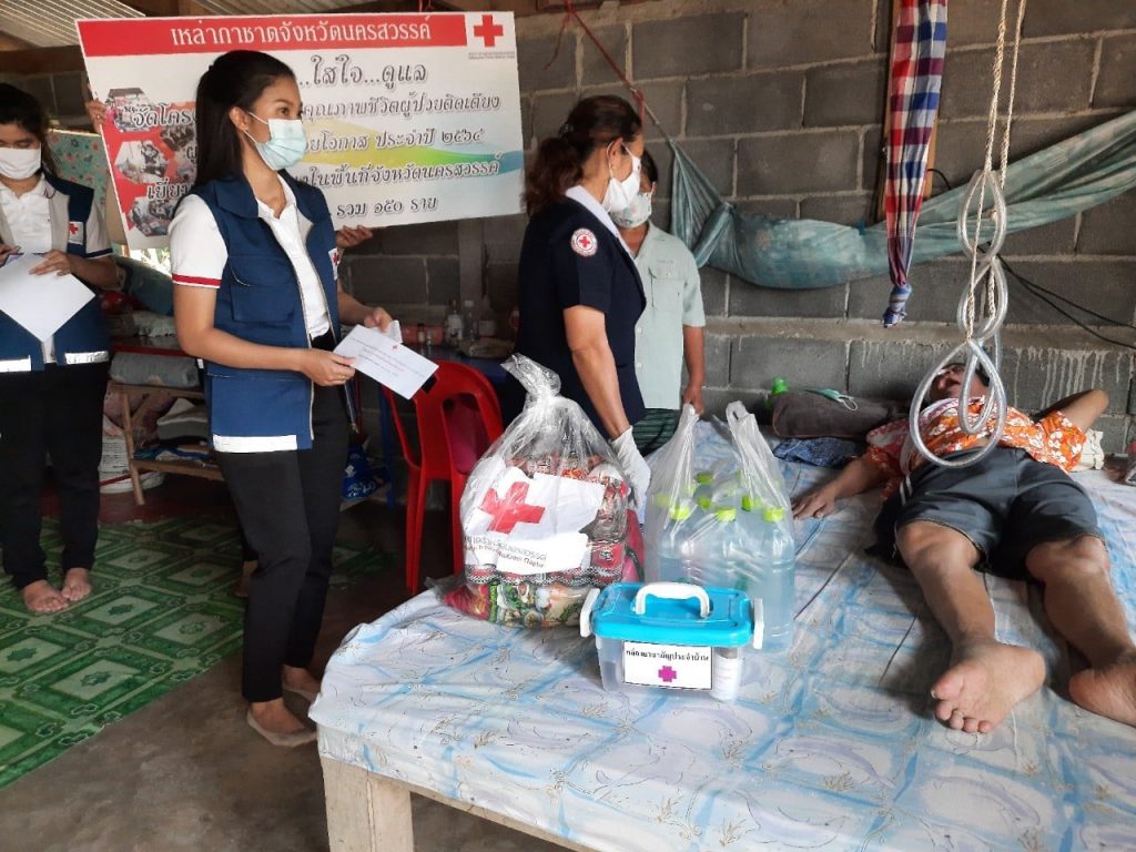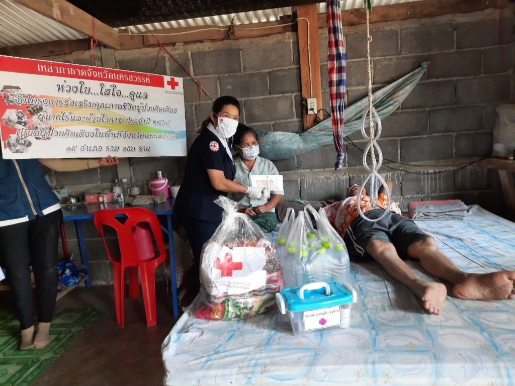 วันที่ 1 กุมภาพันธ์ 2564 นางสุกัญญา ชุมอุปการ นายกเหล่ากาชาดจังหวัดนครสวรรค์ ได้มอบหมายให้ นางวิยดา พลับน้อย รองนายกเหล่ากาชาดจังหวัดนครสวรรค์ พร้อมคณะ ร่วมกับ อำเภอชุมตาบง สาธารณสุขจังหวัดนครสวรรค์และอำเภอชุมตาบง อสม.ในพื้นที่ ลงพื้นที่เยี่ยมผู้ป่วยติดเตียงในโครงการ “ส่งเสริมสุขภาพชีวิตผู้ป่วยติดเตียง ผู้ยากไร้และด้อยโอกาส ประจำปี 2564” รายนายบุญเลิศ ตามประหัต อายุ 59 ปี บ้านเลขที่ 19/1 หมู่ที่ 1 ตำบลปางสวรรค์ อำเภอชุมตาบง จังหวัดนครสวรรค์ โดยเหล่ากาชาดฯ มอบเงินสงเคราะห์ จำนวน 1,000 บาท พร้อมเครื่องอุปโภค บริโภค และน้ำดื่ม เพื่อเป็นการบรรเทาความเดือดร้อนในเบื้องต้น และให้กำลังใจในการเนินชีวิตต่อไป