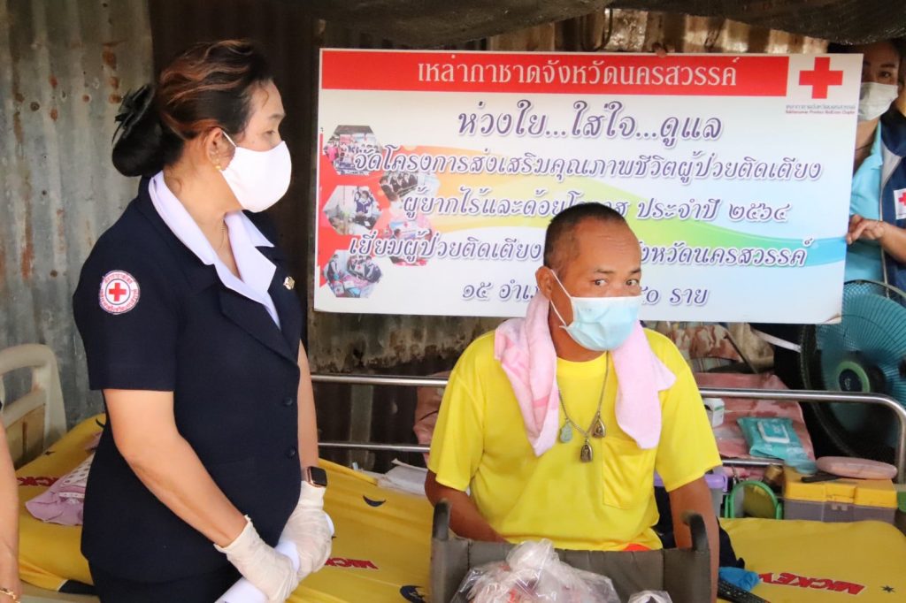 วันที่ 4 กุมภาพันธ์ 2564 นางสุกัญญา ชุมอุปการ นายกเหล่ากาชาดจังหวัดนครสวรรค์ ได้มอบหมายให้นางวิยดา พลับน้อย รองนายกเหล่ากาชาดจังหวัดนครสวรรค์ พร้อมด้วยผู้ช่วยคณะกรรมการและสมาชิกเหล่ากาชาดจังหวัดนครสวรรค์ ร่วมกับ อำเภอบรรพตพิสัย สาธารณสุขจังหวัดนครสวรรค์ พัฒนาสังคมและความมั่นคงของมนุษย์จังหวัดนครสวรรค์ กองอำนวยการรักษาความมั่นคงภายในจังหวัดนครสวรรค์ พัฒนาชุมชนอำเภอบรรพตพิสัย และผู้นำชุมชนในพื้นที่ ลงพื้นที่เยี่ยมผู้ป่วยติดเตียงในโครงการ “ส่งเสริมสุขภาพชีวิตผู้ป่วยติดเตียง ผู้ยากไร้และด้อยโอกาส ประจำปี 2564” รายนายบุญมี เอกปัชชา อายุ 53 ปี บ้านเลขที่ 5/3 หมู่ที่ 11 ตำบลด่านช้าง อำเภอบรรพตพิสัย จังหวัดนครสวรรค์ โดยเหล่ากาชาดฯ มอบเงินสงเคราะห์ จำนวน 1,000 บาท พร้อมเครื่องอุปโภค บริโภค และน้ำดื่ม เพื่อเป็นการบรรเทาความเดือดร้อนในเบื้องต้น และให้กำลังใจในการเนินชีวิตต่อไป