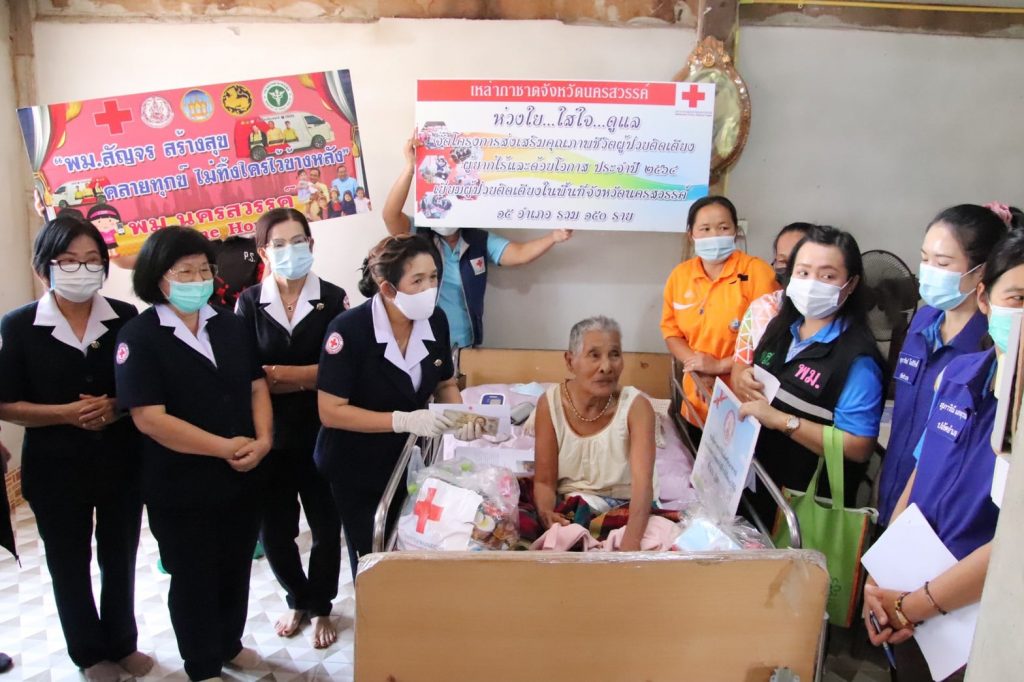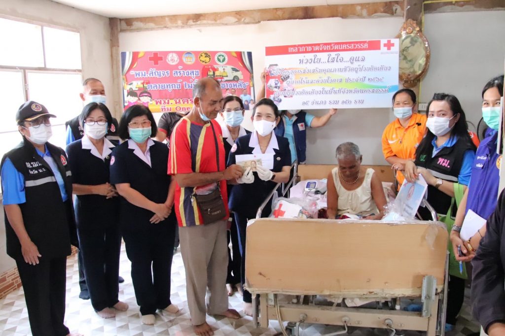 วันที่ 4 กุมภาพันธ์ 2564 นางสุกัญญา ชุมอุปการ นายกเหล่ากาชาดจังหวัดนครสวรรค์ ได้มอบหมายให้นางวิยดา พลับน้อย รองนายกเหล่ากาชาดจังหวัดนครสวรรค์ พร้อมด้วยผู้ช่วย คณะกรรมการและสมาชิกเหล่ากาชาดจังหวัดนครสวรรค์ ร่วมกับ อำเภอบรรพตพิสัย สาธารณสุขจังหวัดนครสวรรค์ พัฒนาสังคมและความมั่นคงของมนุษย์จังหวัดนครสวรรค์ กองอำนวยการรักษาความมั่นคงภายในจังหวัดนครสวรรค์ พัฒนาชุมชนอำเภอบรรพตพิสัย และผู้นำชุมชนในพื้นที่ ลงพื้นที่เยี่ยมผู้ป่วยติดเตียงในโครงการ “ส่งเสริมสุขภาพชีวิตผู้ป่วยติดเตียง ผู้ยากไร้และด้อยโอกาส ประจำปี 2564” ราย นางชา จันทร์ทัญ อายุ 67 ปี บ้านเลขที่ 365 หมู่ที่ 7 ตำบลตาขีด อำเภอบรรพตพิสัย จังหวัดนครสวรรค์ โดยเหล่ากาชาดฯ มอบเงินสงเคราะห์ จำนวน 1,000 บาท พร้อมเครื่องอุปโภค บริโภค และน้ำดื่ม เพื่อเป็นการบรรเทาความเดือดร้อนในเบื้องต้น และให้กำลังใจในการเนินชีวิต