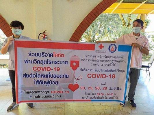 วันที่ 20 เมษายน 2564เหล่ากาชาดจังหวัดสุราษฎร์ธานี และธนาคารเลือด โรงพยาบาลสุราษฎร์ธานีร่วมกับ หอการค้าจังหวัดสุราษฎร์ธานีและ YEC สุราษฎร์ธานีจัดกิจกรรมรับบริจาคโลหิต ดวงตา และอวัยวะ”ให้โลหิตฝ่าวิกฤต COYID-19 คนไทยต้องช่วยกัน”เพื่อเป็นการจัดหาโลหิตสำหรับใช้ในการรักษาผู้ป่วยของโรงพยาบาลในจังหวัดสุราษฎร์ธานี ทั้ง 19 อำเภอ ณ บริเวณหน้าห้องริมน้ำ โรงแรมวังใต้อำเภอเมือง จังหวัดสุราษฎร์ธานี มีผู้มาลงทะเบียนบริจาคโลหิต จำนวน 13 รายได้รับโลหิต จำนวน 10 ยูนิต (คิดเป็น 3,500 ซีซี) ไม่ผ่านการคัดกรอง จำนวน 3 ราย