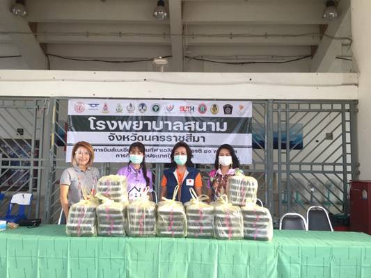 คุณจิรพรรณ ชัยปัทมานนท์ คุณศุภลักษณ์ กาญจนเวนิช คุณวิสุนีย์ แช่มชื่น คุณนงลักษณ์ คณาศักดิ์ โดยได้ส่งมอบให้แก่บุคลากรทางการแพทย์ และเจ้าหน้าที่ที่เกี่ยวข้อง ณ โรงพยาบาลสนามอาคารชาติชายฮอลล์ สนามกีฬาเฉลิมพระเกียรติ 80 พรรษา จังหวัดนครราชสีมา