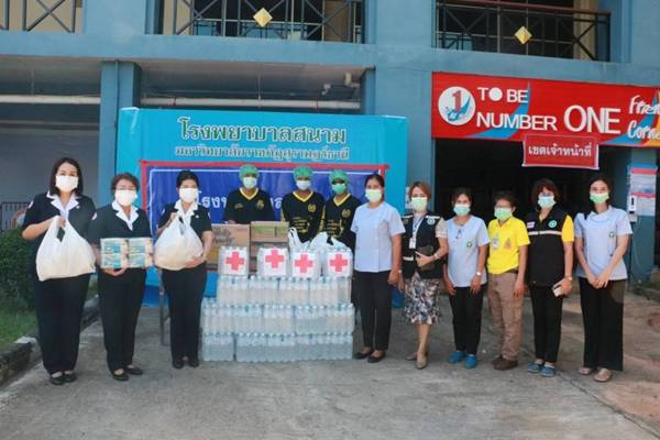 นมดีน่างาดำ 3 ลัง ขนมฟันโอแซนวิสครีม 1 ลัง /น้ำดื่มสิงห์ 30 โหล และหน้ากากอนามัย 5 กล่องไปมอบและให้กำลังใจบุคลากรทางการแพทย์และผู้ปฏิบัติงานที่โรงพยาบาลสนาม มหาวิทยาลัยราชภัฏสุราษฎร์ธานีในสถานการณ์ โรคติดเชื้อโควิด -19ณ โรงพยาบาลสนาม มหาวิทยาลัยราชภัฏสุราษฎร์ธานีอำเภอเมือง จังหวัดสุราษฎร์ธานี โดยมี นางอรวรรณ มีพันธ์และคณะเจ้าหน้าที่สาธารณสุขจังหวัดสุราษฎร์ธานี ร่วมในการรับมอบฯ