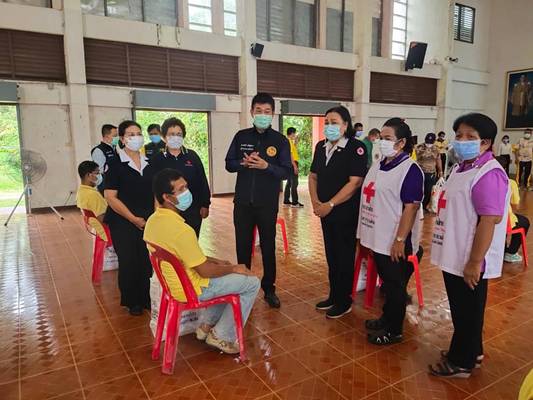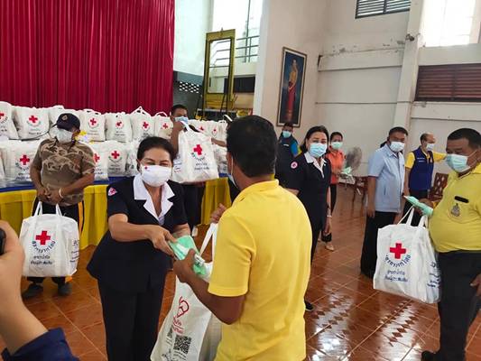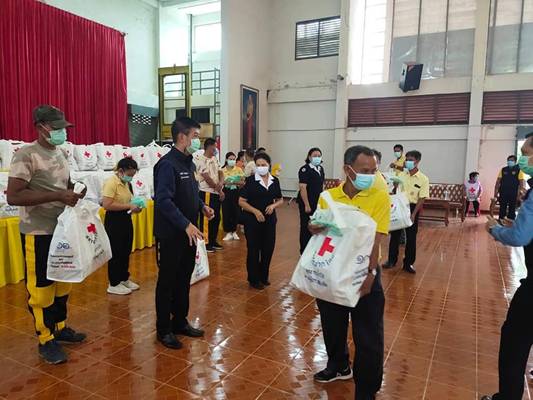 วันที่ 5 พฤษภาคม 2564 นางละมัย เจริญโสภา นายกเหล่ากาชาดจังหวัดตรัง มอบหมายคณะกรรมการและจิตอาสาสภากาชาดไทย บรรจุชุดธารน้ำใจสภากาชาดไทยร่วมกับอำเภอกันตัง เพื่อมอบให้กับผู้นำชุมชนที่มีการระบาดของโควิด-19 ในเขตอำเภอกันตัง จำนวน 386 ชุดโดยมีนายขจรศักดิ์ เจริญโสภา ผู้ว่าราชการจังหวัดตรังเป็นประธานในพิธีมอบ