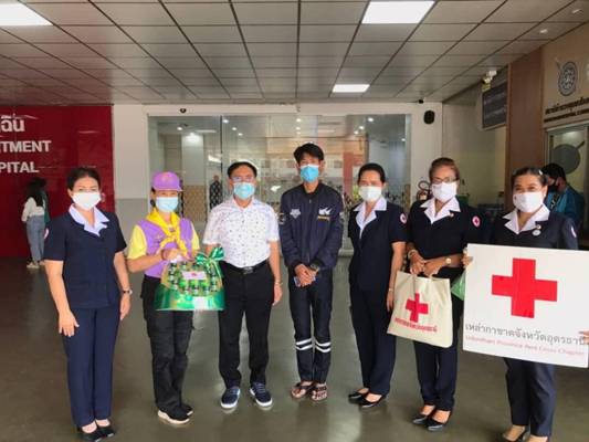 วันที่ 10 ธันวาคม 2563 โดย นายสยาม ศิริมงคล ผู้ว่าราชการจังหวัดอุดรธานี นายกเหล่ากาชาดจังหวัดอุดรธานี มอบหมายให้นายวันชัย จันทร์พร รองผู้ว่าราชการจังหวัดอุดรธานี นางสงวน จันทร์พร รองนายกเหล่ากาชาดจังหวัดอุดรธานี นางจริญญา กังน้อย รองนายกเหล่ากาชาดจังหวัดอุดรธานี พร้อมด้วยกรรมการเหล่ากาชาดและสมาชิกเหล่ากาชาดจังหวัด อุดรธานี ร่วมเยี่ยมและให้กำลังใจ จากเหตุการณ์หญิงกระโดดให้รถไฟทับที่ชานชาลาสถานีรถไฟอุดรธานี ณ โรงพยาบาลอุดรธานี อำเภอเมืองอุดรธานี จังหวัดอุดรธานี โดยได้มอบถุงยังชีพ จำนวน 1 ถุง และกระเช้าของขวัญจำนวน 1 กระเช้า