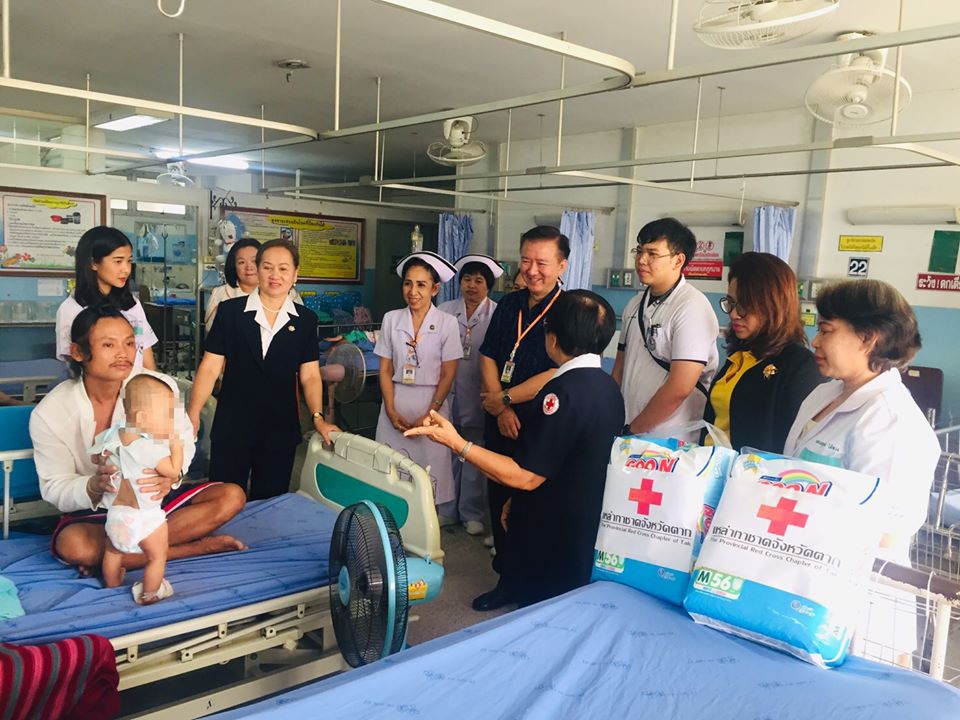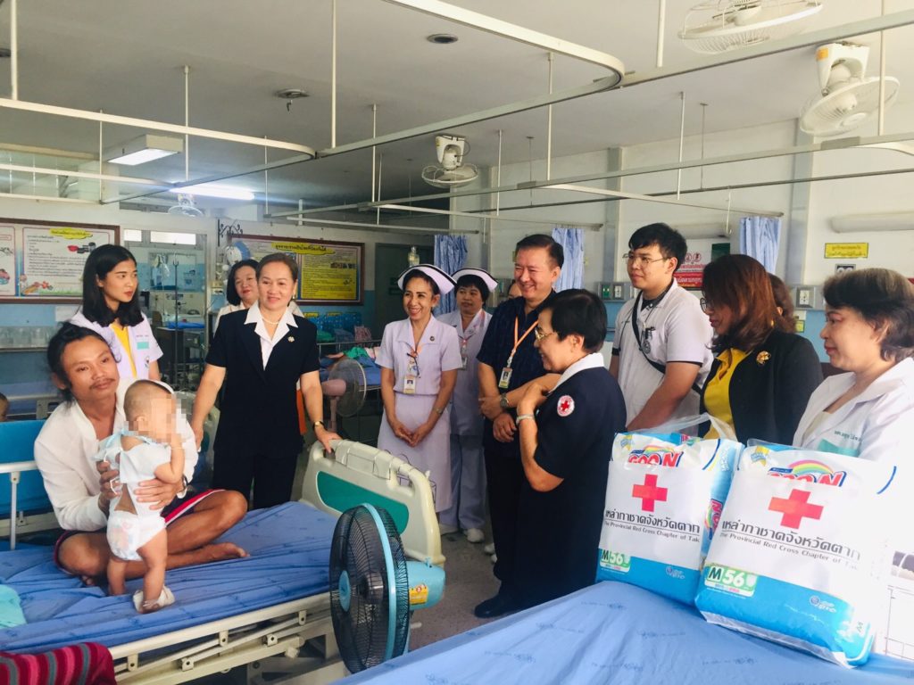 วันที่ 22 มกราคม 2563 นางจิณณารัชช์ สัมพันธรัตน์ นายกเหล่ากาชาดจังหวัดตาก มอบหมายให้ นางสาวละม่อม ขันธเลิศ รองนายกเหล่ากาชาดจังหวัดตาก พร้อมด้วยที่ปรึกษาเหล่ากาชาดจังหวัดตากเยี่ยมผู้ป่วย (ครั้งที่ 2) รายเด็กชายณดล ดนัยนารี อายุ 5 เดือน บ้านเลขที่ 223 หมู่ 10 ตำบลแม่จัน อำเภออุ้มผาง จังหวัดตาก ป่วยเป็นปอดติดเชื้อ (อยู่ระหว่างส่งกลับโรงพยาบาลอุ้มผาง เนื่องจากอาการใกล้หายเป็นปกติ) รักษาตัวอยู่ที่โรงพยาบาลสมเด็จพระเจ้าตากสินมหาราช โดยมอบผ้าอ้อมเด็กสำเร็จรูป จำนวน 2 แพ็ค