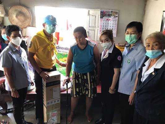 วันที่ 9 มีนาคม 2564 นางจันทรรัตน์ ไตรติลานันท์ นายกเหล่ากาชาดจังหวัดฉะเชิงเทรา พร้อมด้วยนางจันทิรา แก้วกุลปรีชา รองนายกเหล่ากาชาดจังหวัดฉะเชิงเทรา คณะกรรมการและสมาชิกเหล่ากาชาดจังหวัดฉะเชิงเทรา ปลัดอำเภอ เจ้าหน้าที่สาธารณสุขจังหวัด สำนักงานพัฒนาสังคมและความมั่นคงของมนุษย์จังหวัดฉะเชิงเทรา ลงพื้นที่มอบไม้เท้าเลเซอร์พระราชทาน เพื่อส่งมอบให้แก่ผู้ป่วยโรคพาร์กินสันที่มีอาการเดินติด ก้าวขาไม่ออก จำนวน 3 ราย ในพื้นที่ อำเภอเมือง และอำเภอบ้านโพธิ์ จังหวัดฉะเชิงเทรา