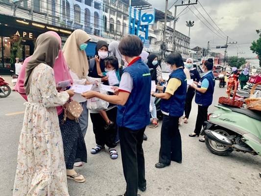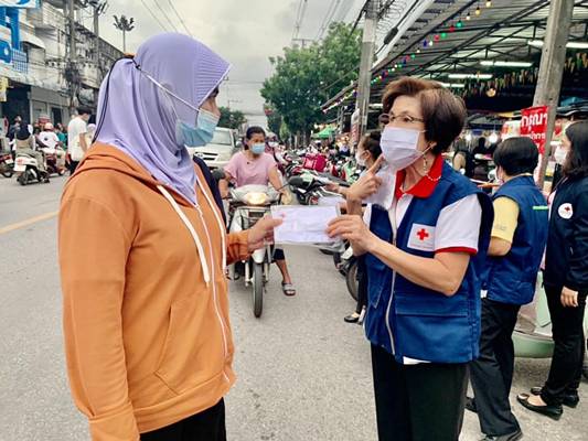 วันที่ 27 เมษายน 2564 นางโสรยา พานิชพงศ์ นายกเหล่ากาชาดจังหวัดยะลา มอบหมายให้กรรมการและสมาชิกเหล่ากาชาดจังหวัดยะลา พร้อมด้วยนายธราวุธ ช่วยเกิด นายอำเภอเมืองยะลา ลงพื้นที่ตลาดประชาชื่น ตำบลสะเตง อำเภอเมืองยะลา จังหวัดยะลา เพื่อเน้นย้ำให้ประชาชนต้องสวมหน้ากากอนามัยหรือหน้ากากผ้าทุกครั้งที่ออกจากบ้าน พร้อมทั้งได้แจกหน้ากากอนามัยตราสัญลักษณ์สภากาชาดไทยให้แก่พ่อค้า แม่ค้าและพี่น้องประชาชนที่มาซื้อสิ่งของและอาหาร จำนวน 500 ชิ้น
