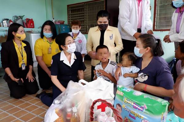 วันที่ 22 ตุลาคม 2563 นางกุลทรัพย์ ชื่นโกสุม นายกเหล่ากาชาดจังหวัดปทุมธานี นายพิษณุ ประภาธนานันท์ นายอำเภอธัญบุรี และนางเบญจมาส แก่นเมือง พมจ.ปท รองนายกเทศมนตรีตำบลธัญบุรี สมาชิกแม่บ้านมหาดไทย สมาชิกเหล่ากาชาดจังหวัดปทุมธานี พร้อมด้วยจนท.สนง.พมจ.ปท และอพม.ลงพื้นที่ให้ความช่วยเหลือครอบครัวนางสาวน้ำฝน (นามสมมุติ) ที่บ้านเลขที่119/465 ม.1.หมู่บ้านเรือนสุข 1 ต.ลำผักกูด อ.ธัญบุรี จ.ปทุมธานี ปรากฏรายละเอียดว่านางสาวน้ำฝน อายุ 31 ปี มีอาชีพเป็นพนักงานเอกชน มีรายได้ประมาณ 17,000 บาท/เดือน อาศัยอยู่กับสามีมีอาชีพเป็นพนักงานส่งของมีรายได้ประมาณ 17,000 บาท/เดือน นางสาวน้ำฝน ต้องรับภาระค่าใช้จ่ายในการดูแลบุตร 2 คน โดยบุตรชายคนที่ 1 อายุ 8 ปี ป่วยเป็นมะเร็งเม็ดเลือดขาว ปัจจุบันเด็กอาศัยอยู่กับยายเด็กที่จ.นครนายก ส่วนบุตรคนที่ 2 ชื่อด.ช.บอม (นามสมมุติ) อายุ 1 ปี ป่วยเป็นโรคถุงน้ำดีอุดตัน ตับและม้ามโต รักษาที่รพ.จุฬาภรณ์ ใช้สิทธิ์บัตรประกันสุขภาพถ้วนหน้า ปัจจุบันด.ช.บอม อาศัยอยู่กับย่าทวดของเด็ก อายุ 59 ปี โดยสมาชิกครอบครัวย่าทวด อยู่ในวัยชราภาพ ได้แก่สามีย่าทวด อายุ 62 ปี พี่สาวย่าทวดอายุ 68 ปี พี่ชายย่าทวดอายุ 64 ปี และมารดาของย่าทวดอายุ 89 ปีมีสุขภาพไม่แข็งแรง เดินไม่ไหว หูได้ยินไม่ชัดเจน มีอาการหลงลืม ปัจจุบันนางสาวน้ำฝน เช่าห้องพักอยู่กับสามีแถวรังสิต มีค่าใช้จ่ายในการส่งรถ 11,400 บาท/เดือน ค่าเช่าห้อง 3,800 บาท/เดือน ค่านมบุตรคนเล็กและค่าผ้าอ้อมสำเร็จรูปประมาณ 5,000 บาท/เดือน และต้องส่งเงินให้ยายเด็กที่จ.นครนายก เดือนละ 4,000 บาท รวมถึงค่าใช้จ่ายในการเดินทางพาบุตรคนเล็กไปพบแพทย์ประมาณ 2-3 ครั้งต่อเดือน ค่าใช้จ่ายส่วนเกินของบัตรประกันสุขภาพถ้วนหน้า และค่าใช้จ่ายต่าง ๆ ภายในครอบครัว ทั้งนี้ เด็กทั้ง 2 คน เป็นคนไข้ พอ.สว แล้ว และทั้งนี้เหล่ากาชาดจังหวัดปทุมธานีได้มอบเงินช่วยเหลือเบื้องต้น จำนวน 3,000 บาท ถุงยังชีพจำนวน 1 ชุด นม และผ้าอ้อม เพื่อเป็นกกำลังใจต่อไป