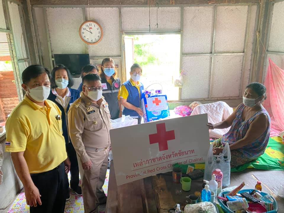 วันที่ 20 กันยายน 2564 นางจุฬาภร ศิริเวช นายกเหล่ากาชาดจังหวัดชัยนาท มอบหมายให้คณะกรรมการเหล่ากาชาด หน่วยงานที่เกี่ยวข้อง ลงพื้นที่เยี่ยมและให้กำลังใจพร้อมมอบถุงยังชีพ ชุดเครื่องนอน ผ้าอ้อมสำเร็จรูปสำหรับผู้ใหญ่ จำนวน 3 ราย ได้แก่