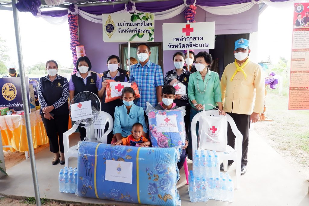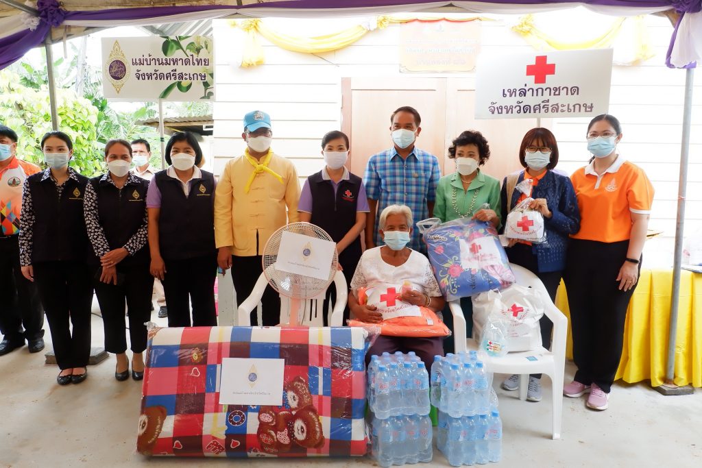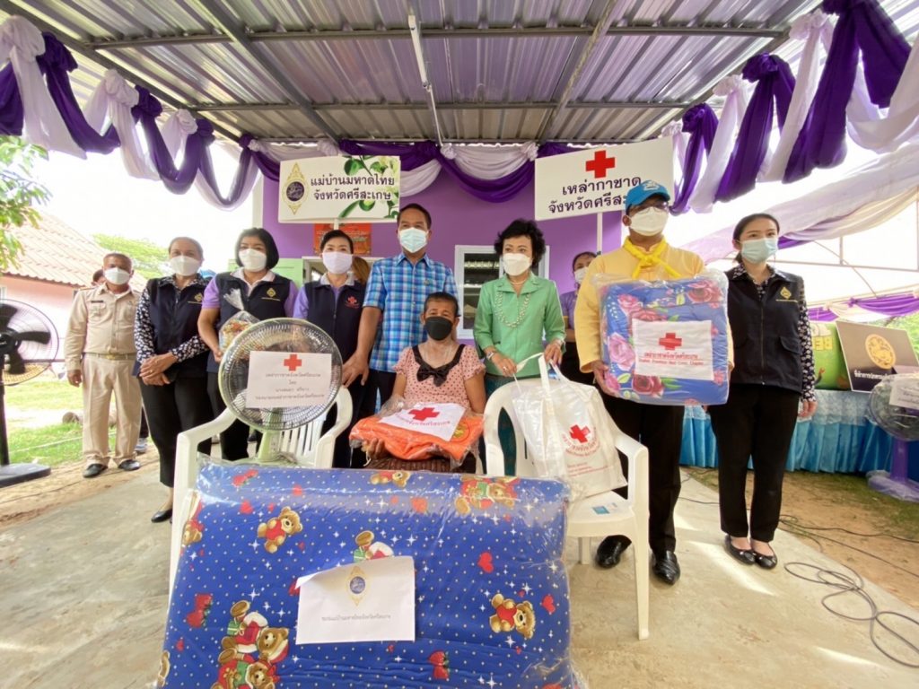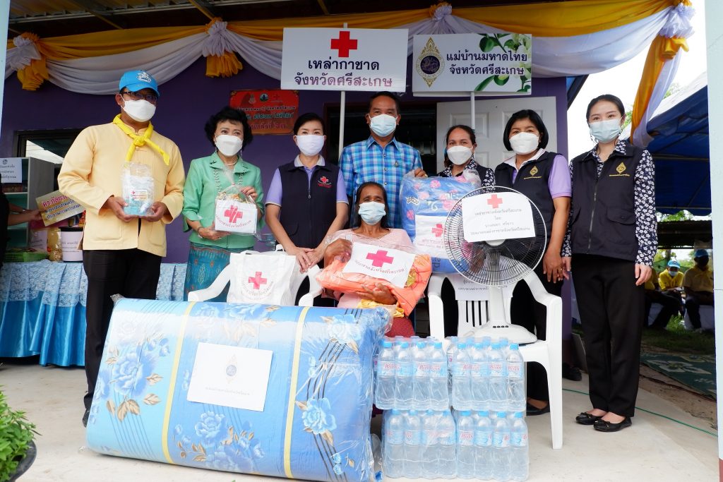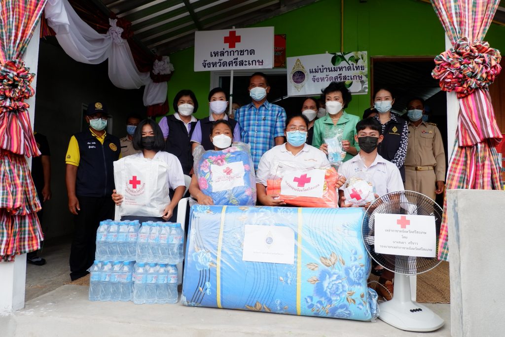 โดยเหล่ากาชาดจังหวัดศรีสะเกษ ได้มอบถุงยังชีพ พัดลมตั้งโต๊ะ ผ้าห่ม ที่นอน มุ้ง ชุดกิ๊ฟเซ็ตป้องกันโควิดด-19 น้ำดื่ม ชุดนมและขนม ให้กับครอบครัวผู้ยากไร้ที่ได้รับมอบบ้านทั้ง 5 รายดังกล่าวข้างต้น พร้อมนี้เหล่ากาชาดจังหวัดศรีสะเกษได้มอบชุดกิ๊ฟเซ็ตป้องกันโควิด-19 จำนวน 100 ชุด ประกอบด้วย เจลแอลกอฮอล์ และหน้ากากผ้า ให้ประชาชนที่มาร่วมพิธีมอบบ้านเพื่อใช้ในการป้องกันตนเองภายใต้สถานการณ์การแพร่ระบาดของโรคติดเชื้อไวรัสโคโรนา 2019 และมอบไม้เท้าก้านร่มจำนวน 3 อัน ให้แก่ผู้สูงอายุที่มีปัญหาทางการเคลื่อนไหว เพื่อนำไปใช้ในชีวิตประจำในการเคลื่อนไหวได้สะดวก และมีคุณภาพชีวิตที่ดีขึ้น โดยมีนายวัฒนา พุฒิชาติ ผู้ว่าราชการจังหวัดศรีสะเกษ/ประธานที่ปรึกษาคณะกรรมการเหล่ากาชาดจังหวัดศรีสะเกษ เป็นประธานในพิธีมอบบ้าน ประธานแม่บ้านมหาดไทยจังหวัดศรีสะเกษ หัวหน้าสำนักงานป้องกันและบรรเทาสาธารณภัยจังหวัดศรีสะเกษ ผู้แทนพัฒนาสังคมและความมั่นคงของมนุษย์จังหวัดศรีสะเกษ หัวหน้าส่วนราชการในสังกัดกระทรวงพัฒนาสังคมและความมั่นคงของมนุษย์จังหวัดศรีสะเกษ ผู้แทนเกษตรจังหวัดศรีสะเกษ ผู้แทนประชาสัมพันธ์จังหวัดศรีสะเกษ ผู้แทนพัฒนาการจังหวัดศรีสะเกษ ผู้แทนผู้อำนวยการศูนย์การศึกษาพิเศษประจำจังหวัดศรีสะเกษ ดร.กัลยาณี ธรรมจารีย์ ประธานสภาอุตสาหกรรมท่องเที่ยวจังหวัดศรีสะเกษ/นายกสมาคมส่งเสริมเครือข่ายการท่องเที่ยวจังหวัดศรีสะเกษ นายอำเภอโพธิ์ศรีสุวรรณ หัวหน้าส่วนราชการอำเภอโพธิ์ศรีสุวรรณ ผู้บริหารองค์กรปกครองส่วนท้องถิ่น กำนัน ผู้ใหญ่บ้าน อาสาสมัครสาธารณสุขประจำหมู่บ้าน (อสม.) และประชาชนในพื้นที่เข้าร่วมพิธีมอบบ้านในครั้งนี้ ทั้งนี้ ได้ถือปฏิบัติตามมาตรการป้องการแพร่ระบาดของโรคติดเชื้อไวรัสโคโรนา 2019 (COVID-19) อย่างเคร่งครัด