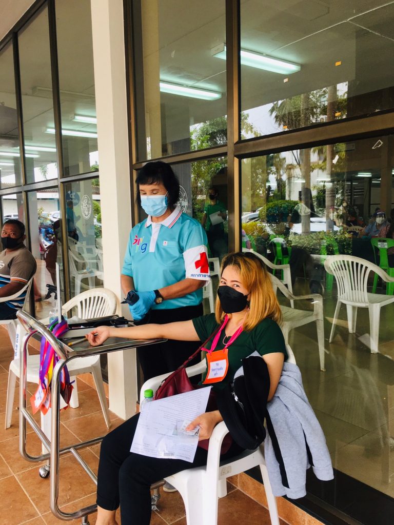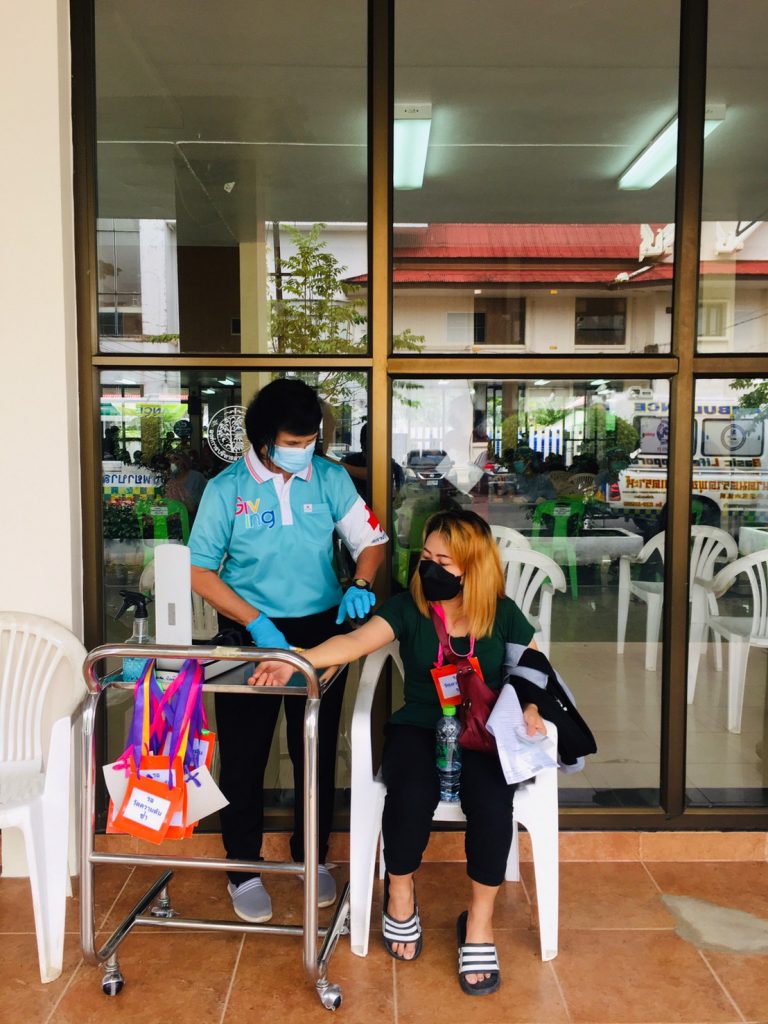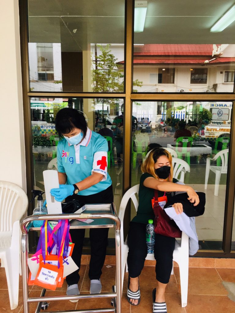วันที่ 6 ตุลาคม 2564 นางชุลีพร เตรัตน์ นายกเหล่ากาชาดจังหวัดตราด ส่งอาสาสมัครร่วมให้บริการฉีดวัคซีนป้องกันโควิด – 19 ณ ศาลาประชาคมจังหวัดตราด จำนวน 2 ราย โดยร่วมปฏิบัติงานให้บริการคัดกรอง (วัดอุณหภูมิ, วัดความดันโลหิต, ชั่งน้ำหนัก) และบริการจัดคิวอำนวยความสะดวกของผู้มารับบริการ โดยในวันนี้สำนักงานสาธารณสุขอำเภอเมืองตราด ร่วมกับโรงพยาบาลตราด ได้ให้บริการฉีดวัคซีนป้องกันโควิด – 19 เข็มที่ 1 ให้กับประชาชนทั่วไปที่มีใบนัดในระบบจองคิว รวมกว่า 2,300 คน
