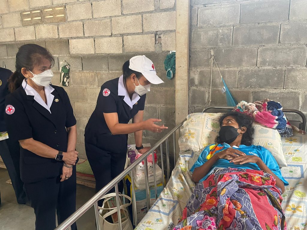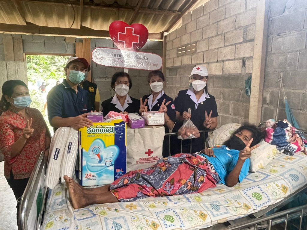 ในการนี้ เหล่ากาชาดจังหวัดตรังมอบชุดธารน้ำใจ คนละ 1 ชุด และผ้าอ้อมสำเร็จรูปเพื่อช่วยเหลือในเบื้องต้น