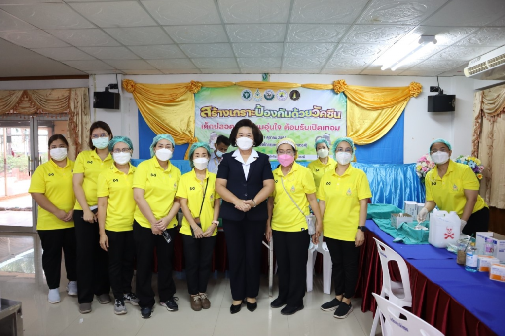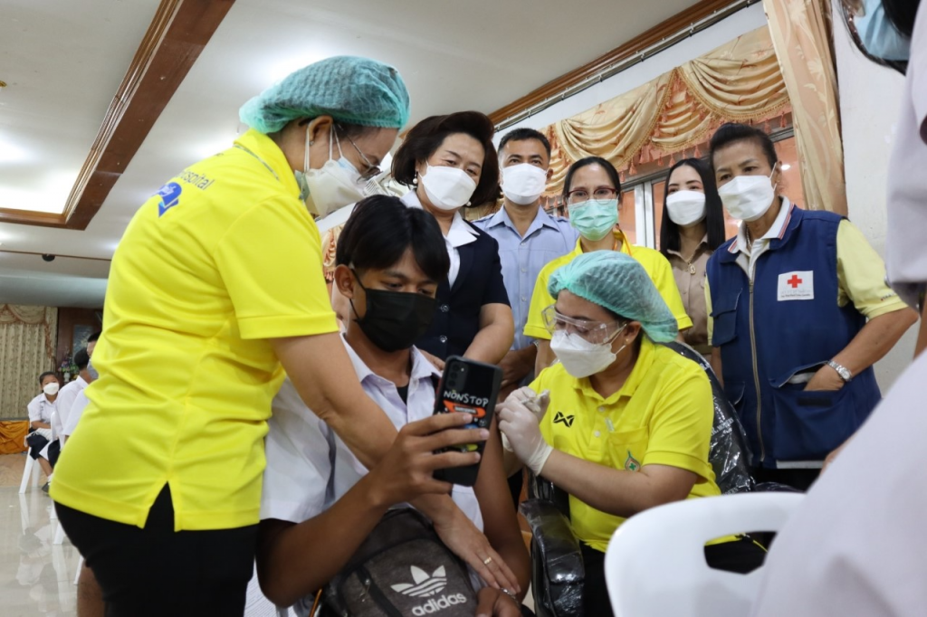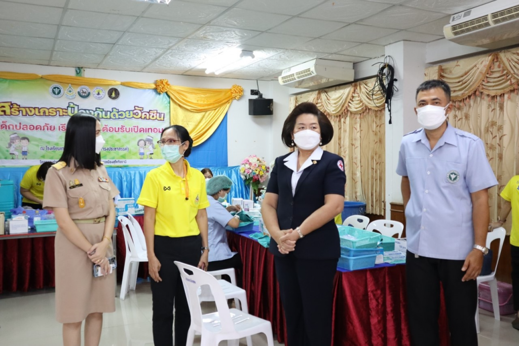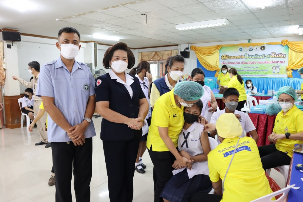 วันที่ 11 ตุลาคม 2564 นางกนกพร พรรณเทวี นายกเหล่ากาชาดจังหวัดสุโขทัย พร้อมด้วยเจ้าหน้าที่สาธารณสุข ลงพื้นที่ตรวจเยี่ยมและให้กำลังใจการฉีดวัคซีนไฟเซอร์ ให้กับนักเรียน ‘สร้างเกราะป้องกันด้วยวัคซีน เด็กปลอดภัย เรียนอุ่นใจ ต้อนรับเปิดเทอม” โดยมีคณะครูโรงเรียนเทศบาลวัดไทยชุมพล เจ้าหน้าที่โรงพยาบาลสุโขทัย ร่วมกิจกรรมในครั้งนี้ด้วย นักเรียนที่ได้รับการฉีดวัคซีนจำนวน 954 ราย ณ โรงเรียนเทศบาลวัดไทยชุมพล อำเภอเมืองสุโขทัย จังหวัดสุโขทัย