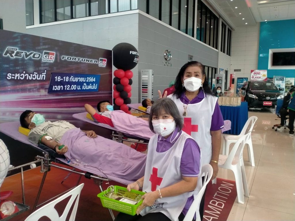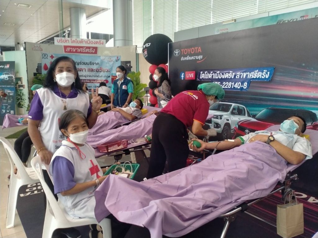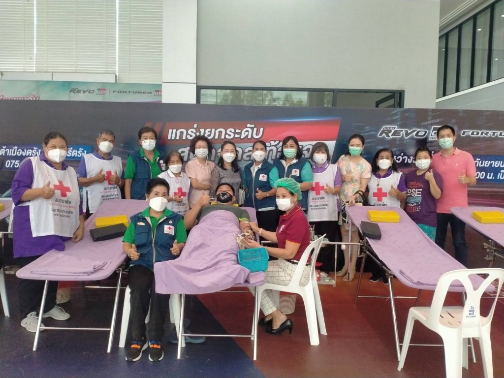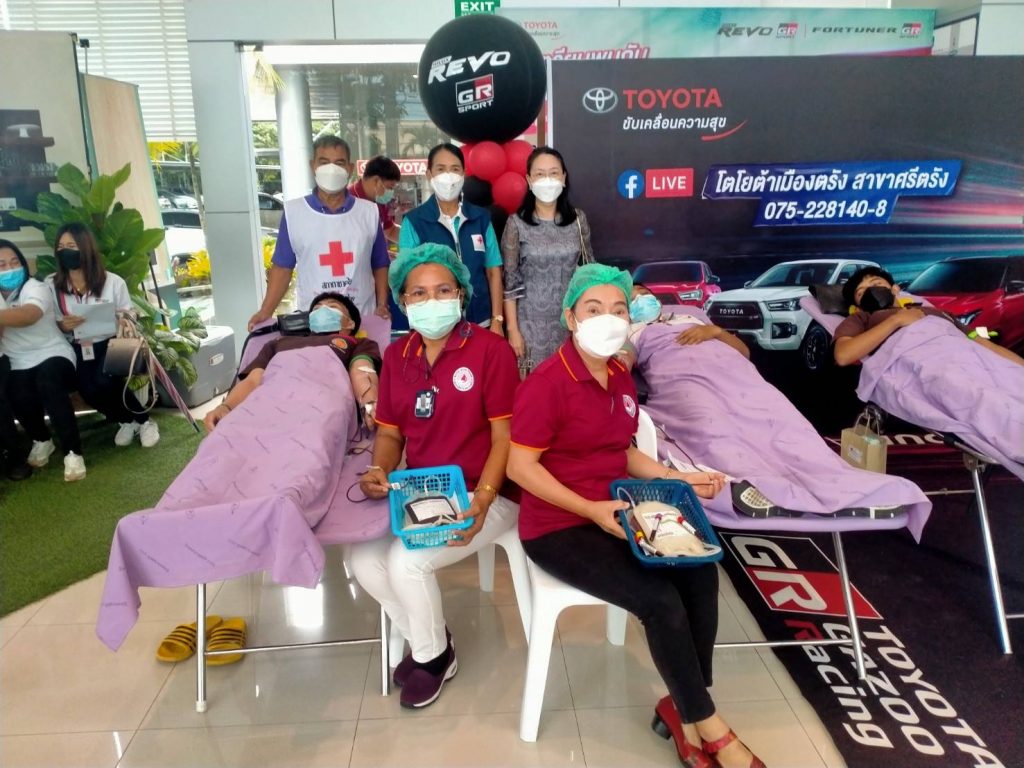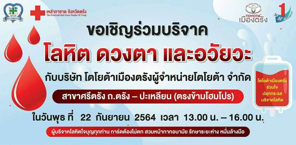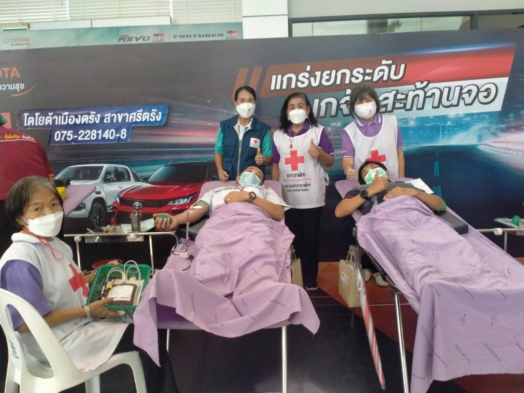 วันที่ 22 กันยายน 2564 นางละมัย เจริญโสภา นายกเหล่ากาชาดจังหวัดตรัง มอบหมายคณะกรรมการเหล่ากาชาด สมาชิก เจ้าหน้าที่ และจิตอาสาสภากาชาดไทย ร่วมกับธนาคารเลือดโรงพยาบาลตรัง ออกหน่วยรับบริจาคโลหิต ดวงตา และอวัยวะ ณ บ.โตโยต้าเมืองตรัง จก. สาขาศรีตรัง มีผู้บริจาคทั้งหมด 86 ราย ได้โลหิต 64 ยูนิต คิดเป็นปริมาณ 25,600 ซีซี. มีผู้แสดงความจำนงบริจาคดวงตา จำนวน 11 ราย และผู้แสดงความจำนงบริจาคอวัยวะ 13 ราย ผู้รับเข็มที่ระลึกบริจาคโลหิต7 ครั้ง 14 ราย, 16 ครั้ง 3 ราย และ24 ครั้ง 1 ราย พร้อมมอบหน้ากากอนามัยกับสายคล้องคอ 65 ชิ้น