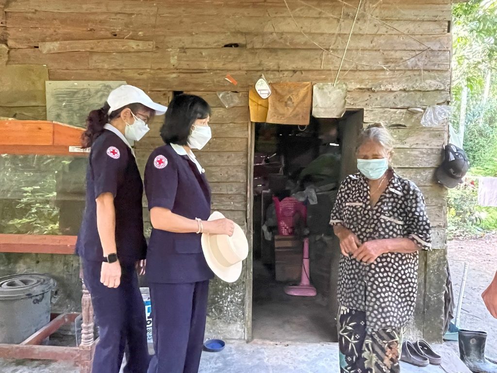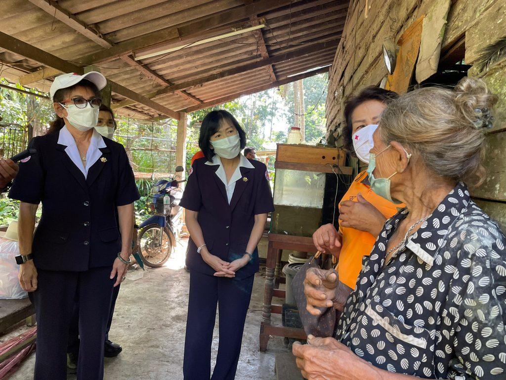 ในการนี้ เหล่ากาชาดจังหวัดตรังมอบชุดธารน้ำใจ คนละ 1 ชุด และผ้าอ้อมสำเร็จรูปเพื่อช่วยเหลือในเบื้องต้น