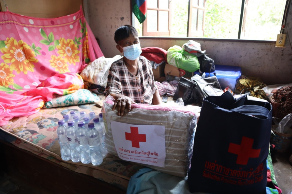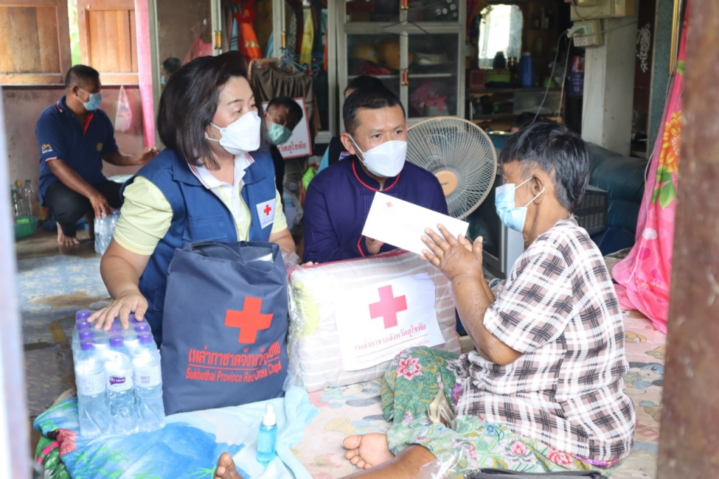 วันที่ 12 ตุลาคม 2564 นางกนกพร พรรณเทวี นายกเหล่ากาชาดจังหวัดสุโขทัย พร้อมด้วยนายชยชัย แสงอินทร์ รองผู้ว่าราชการจังหวัดสุโขทัย ปลัดอำเภอเมืองสุโขทัย เจ้าหน้าที่พัฒนาสังคมและความมั่นคงของมนุษย์จังหวัดสุโขทัย เจ้าหน้าที่สาธารณสุขอำเภอเมืองสุโขทัยและผู้นำชุมชน เยี่ยมผู้ป่วยติดเตียง ยากไร้ หญิงอายุ 67 ปี กล้ามเนื้ออ่อนแรง และเป็นโรคไตระยะสุดท้าย เหล่ากาชาดจังหวัดสุโขทัย ได้มอบเงินช่วยเหลือ 1,000 บาท ถุุงธารน้ำใจ น้ำดื่ม ผ้าห่ม ณ ตำบลตาลเตี้ย อำเภอเมืองสุโขทัย จังหวัดสุโขทัย