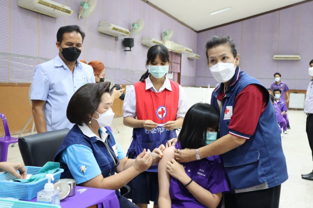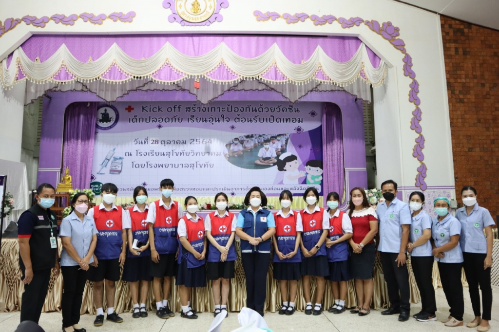 วันที่ 28 ตุลาคม 2564 นางกนกพร พรรณเทวี นายกเหล่ากาชาดจังหวัดสุโขทัย พร้อมด้วยเจ้าหน้าที่สาธารณสุข ลงพื้นที่เยี่ยมและให้กำลังใจการฉีดวัคซีนไฟเซอร์ ให้กับนักเรียน ‘สร้างเกราะป้องกันด้วยวัคซีน เด็กปลอดภัย เรียนอุ่นใจ ต้อนรับเปิดเทอม” โดยมีคณะครูโรงเรียนสุโขทัยวิทยาคม เจ้าหน้าที่โรงพยาบาลสุโขทัย จิตอาสายุวกาชาด ร่วมกิจกรรมในครั้งนี้ด้วย นักเรียนที่ได้รับการฉีดวัคซีนจำนวน 2,340 ราย ณ โรงเรียนสุโขทัยวิทยาคม อำเภอเมืองสุโขทัย จังหวัดสุโขทัย