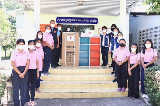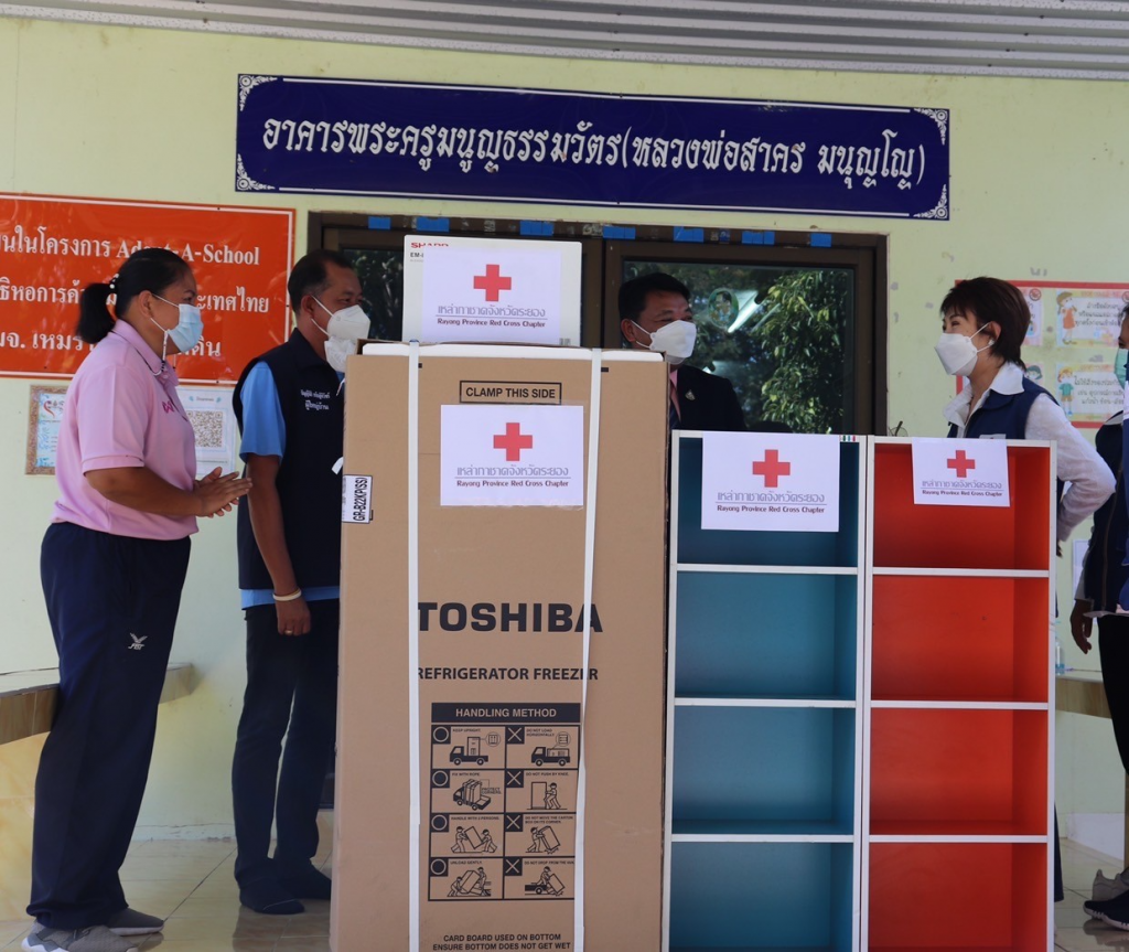 วันที่ 11 พฤศจิกายน 2564 นางธัมมิกา เอี่ยมแสง นายกเหล่ากาชาดจังหวัดระยอง พร้อมด้วยรองนายกเหล่ากาชาดจังหวัดระยอง และกรรมการเหล่ากาชาดจังหวัดระยอง ร่วมมอบอุปกรณ์เครื่องครัว (ตู้เย็น,เครื่องปั่นน้ำผลไม้,ชั้นวางของเอนกประสงค์ 4 ชั้น) เพื่อช่วยเหลือแก่โรงเรียนนิคมสร้างตนเองจังหวัดระยอง 6 ที่ประสบเหตุวาตภัย พายุฝนฟ้าคะนองลมกระโชกแรงทำให้ต้นไม้หักโค่นทับโรงอาหารได้รับความเสียหาย ณ โรงเรียนนิคมสร้างตนเองจังหวัดระยอง 6 ตำบลนิคมพัฒนา อำเภอนิคมพัฒนา จังหวัดระยอง