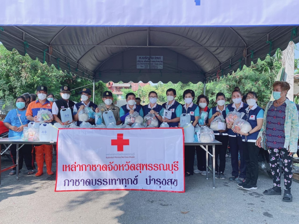 วันที่ 1 ตุลาคม 2564 นายณัฐภัทร สุวรรณประทีป ผู้ว่าราชการจังหวัดสุพรรณบุรี นางนภัสสร สุวรรณประทีป นายกเหล่ากาชาดจังหวัดสุพรรณบุรี พร้อมด้วยที่ปรึกษา กรรมการและสมาชิกเหล่ากาชาดจังหวัด มอบถุงยังชีพช่วยเหลือผู้ประสบอุทกภัย จำนวน 200 ราย โดยเหล่ากาชาดจังหวัดสุพรรณบุรี มอบถุงยังชีพ รายละ 1 ชุด เทศบาลตำบลท่าระหัด มอบหน้ากากอนามัย เจลแอลกอฮอล์ รายละ 1 ชุด และกระทรวงทรัพยากรธรรมชาติและสิ่งแวดล้อม มอบน้ำแร่ รายละ 1 แกลลอน ณ ชุมชนวัดมเหยงค์ ต.ท่าระหัด อ.เมืองสุพรรณบุรี จ.สุพรรณบุรี