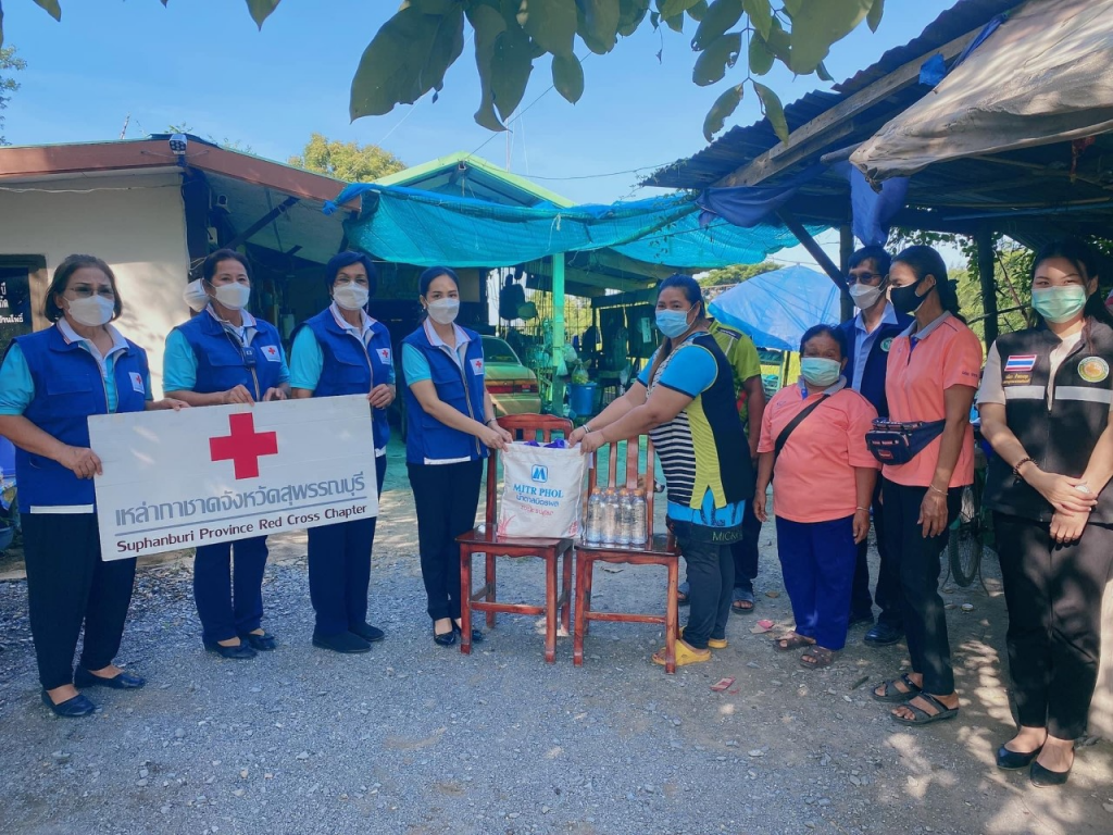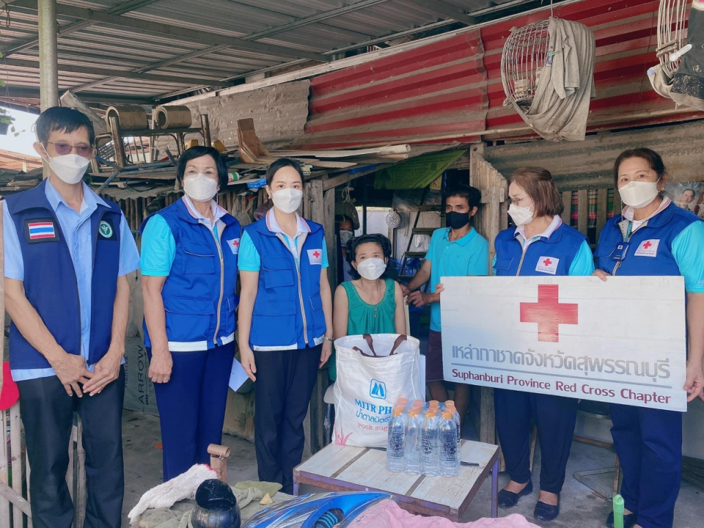 โดย เหล่ากาชาดจังหวัดสุพรรณบุรี มอบเครื่องอุปโภค – บริโภค รายละ 1 ชุด น้ำดื่ม ขนาด 600 มิลลิลิตร รายละ 1 แพ็ค และเงินช่วยเหลือ รายละ 500 บาท ณ ตำบลบ้านโพธิ์ อำเภอเมืองสุพรรณบุรี จังหวัดสุพรรณบุรี