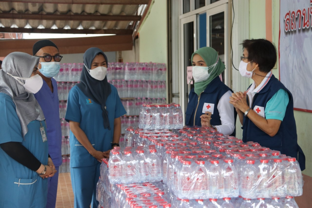 วันที่ 10 พฤศจิกายน 2564 ผศ.ดร.ทิพยวรรณ นิลทยา นายกเหล่ากาชาดจังหวัดยะลา มอบหมายให้ นางอาสีกี บุญโรภาคย์ กรรมการเหล่ากาชาดจังหวัดยะลา/ภริยานายอำเภอรามัน พร้อมด้วย กรรมการเหล่ากาชาดจังหวัดยะลา สมาชิกสมาคมแม่บ้านมหาดไทยจังหวัดยะลา ลงพื้นที่เยี่ยมให้กำลังใจและมอบน้ำดื่มตราสัญลักษณ์กาชาด ขนาด 350 มล. จำนวน 200 แพ็ค ละ 12 ขวด รวมเป็น 2,400 ขวด ให้แก่เจ้าหน้าที่ประจำสถานที่แยกกัก (Community Isolation) โดยมี คุณนุจรี จันทร์ที พยาบาลวิชาชีพชำนาญการ รับมอบในครั้งนี้ ณ โรงเรียนดารุลฮูดาห์วิทยา ต.วังพญา อ.รามัน จ.ยะลา