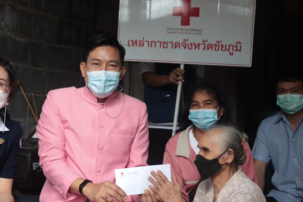 วันที่ 23 พฤศจิกายน 2546 นางกรรณิกา กองฉลาด นายกเหล่ากาชาดจังหวัดชัยภูมิ มอบหมายให้นางธีราพร เสนาะคำ พร้อมด้วยกรรมการเหล่ากาชาดจังหวัดชัยภูมิ สมาชิกสภากาชาดไทยอำเภอซับใหญ่ ออกเยี่ยมและให้กำลังใจนางสอ วรรณศรี เป็นผู้สูงอายุ พิการ อาศัยอยู่กับครอบครัว 3 คน ไม่มีที่ดินทำกิน สามีมีอาชีพรับจ้างตัดหญ้า เป็นผู้ดูแล ทั้งนี้ เหล่ากาชาดจังหวัดชัยภูมิได้มอบเงินช่วยเหลือ ถุงยังชีพ และสิ่งของเครื่องใช้