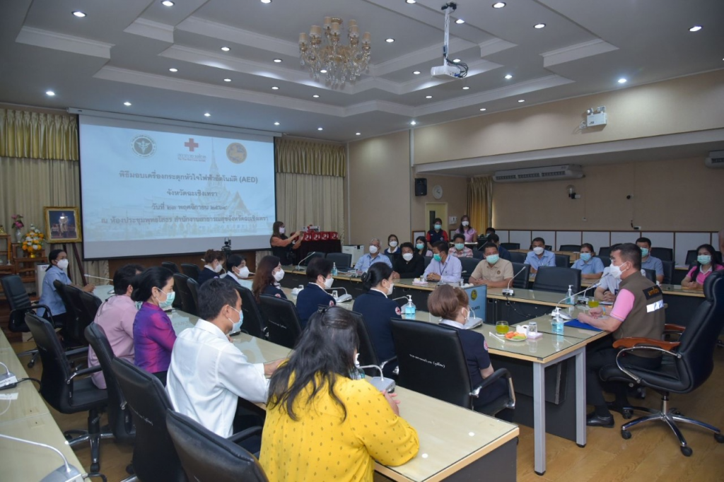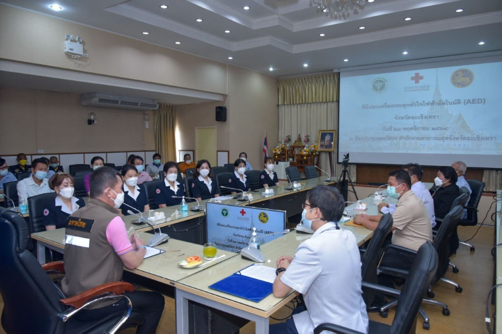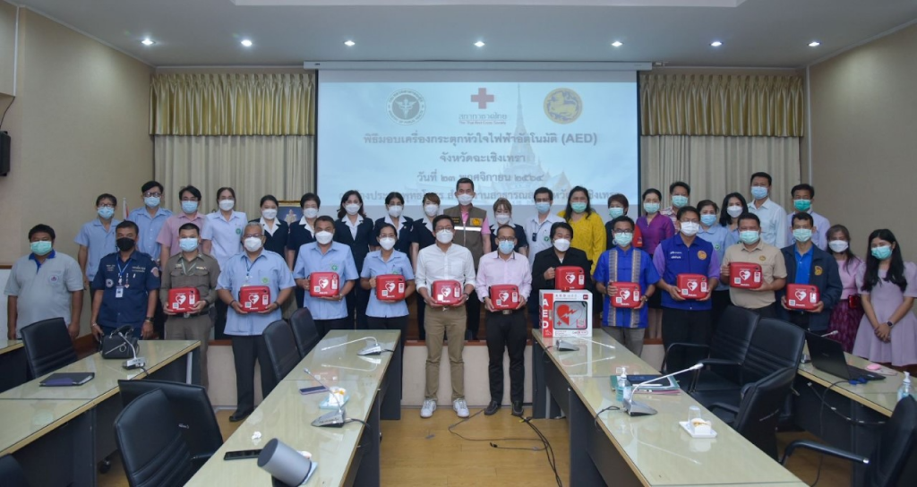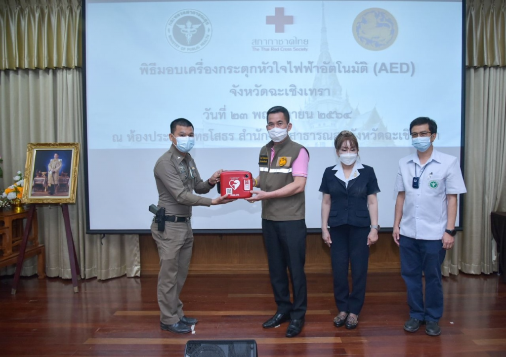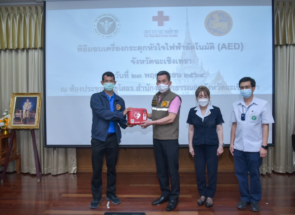 วันที่ 23 พฤศจิกายน พ.ศ. 2564 นางจันทรรัตน์ ไตรติลานันท์ นายกเหล่ากาชาดจังหวัดฉะเชิงเทรา พร้อมด้วยคณะกรรมการสมาชิกเหล่ากาชาดจังหวัดฉะเชิงเทรา ร่วมรับมอบเครื่องกระตุกหัวใจไฟฟ้าอัตโนมัติ(AED) จำนวน 12 เครื่อง โดยบริษัท อินโนเวชั่นส์ จำกัด เป็นผู้ส่งมอบเครื่องฯ พร้อมตู้เก็บเครื่องกระตุกหัวใจ รุ่น HEART START FRX ผลิตภัณฑ์ PHILIPS จำนวน 12 เครื่อง โดยสำนักงานสาธารณสุขจังหวัดฉะเชิงเทรา ได้ดำเนินการส่งมอบและติดตั้งตามพื้นที่เป้าหมายต่อไป ณ สำนักงานสาธารณสุขจังหวัดฉะเชิงเทรา ตำบลหน้าเมือง อำเภอเมือง จังหวัดฉะเชิงเทรา