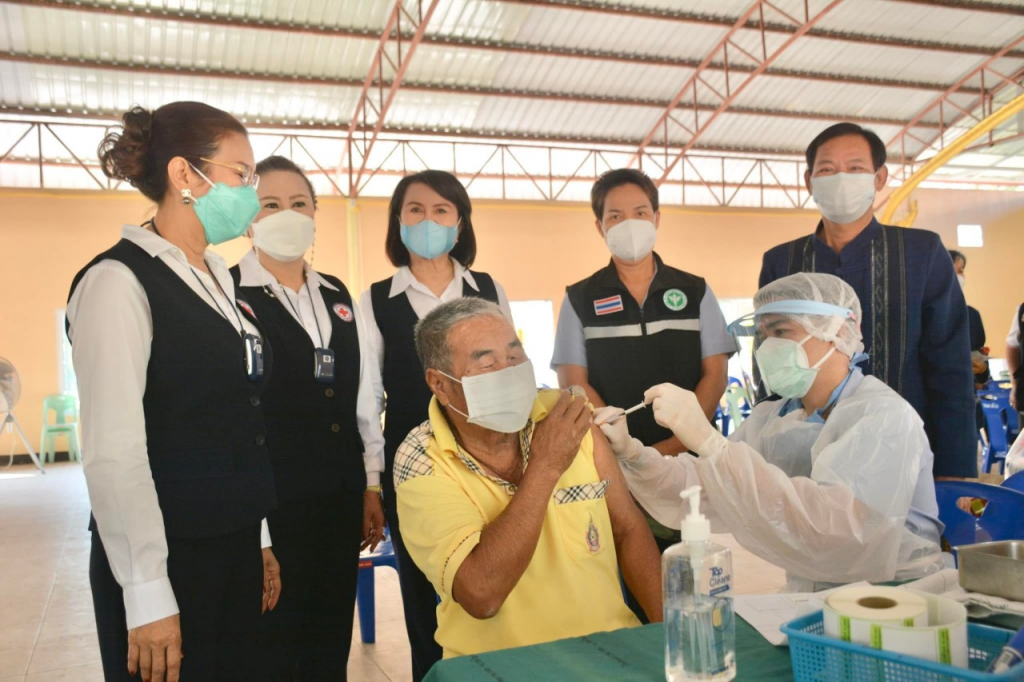 วันที่ 30 พฤศจิกายน 2564 นางนงค์นิตย์ เนียมศิริ นายกเหล่ากาชาดจังหวัดเลย พร้อมด้วยนางขนิษฐา พินิจพานิชย์ รองนายกเหล่ากาชาดจังหวัดเลย , กรรมการเหล่ากาชาดจังหวัดเลย , ที่ปรึกษาเหล่ากาชาดจังหวัดเลย , ร่วมกับนายสุรเดช สร้อยอุทา นายอำเภอนาด้วง , สาธารณสุขอำเภอนาด้วง ออกเยี่ยมให้กำลังใจ ผู้ที่เข้ารับบริการฉีดวัคซีน Moderna ที่ได้รับการสนับสนุนจากสภากาชาดไทย ให้กับกลุ่มเป้าตามเกณฑ์สภากาชาดไทย จำนวน 40 ราย ณ วัดเวียงล้อม ต.นาด้วง อ.นาด้วง จ.เลย พร้อมมอบเจลล้างมือแอลกอฮอล์ หน้ากากอนามัยแบบผ้า และปลาร้าบรรจุขวด ให้กับผู้เข้าบริการฉีดวัคซีนในครั้งนี้