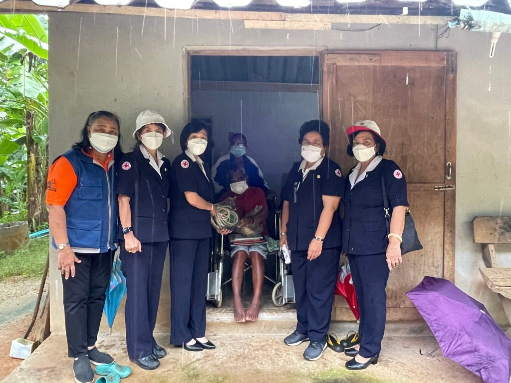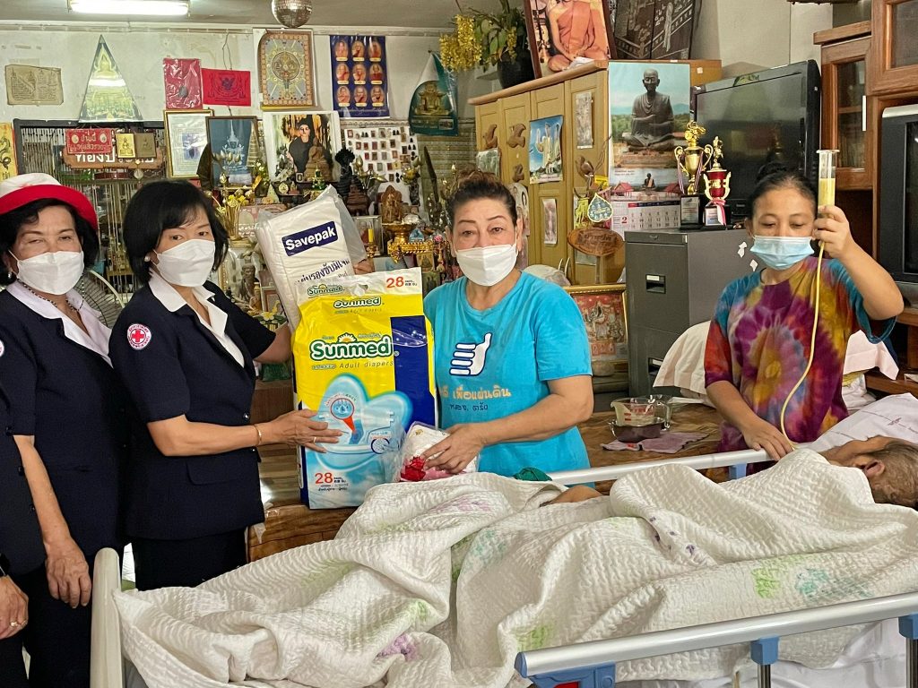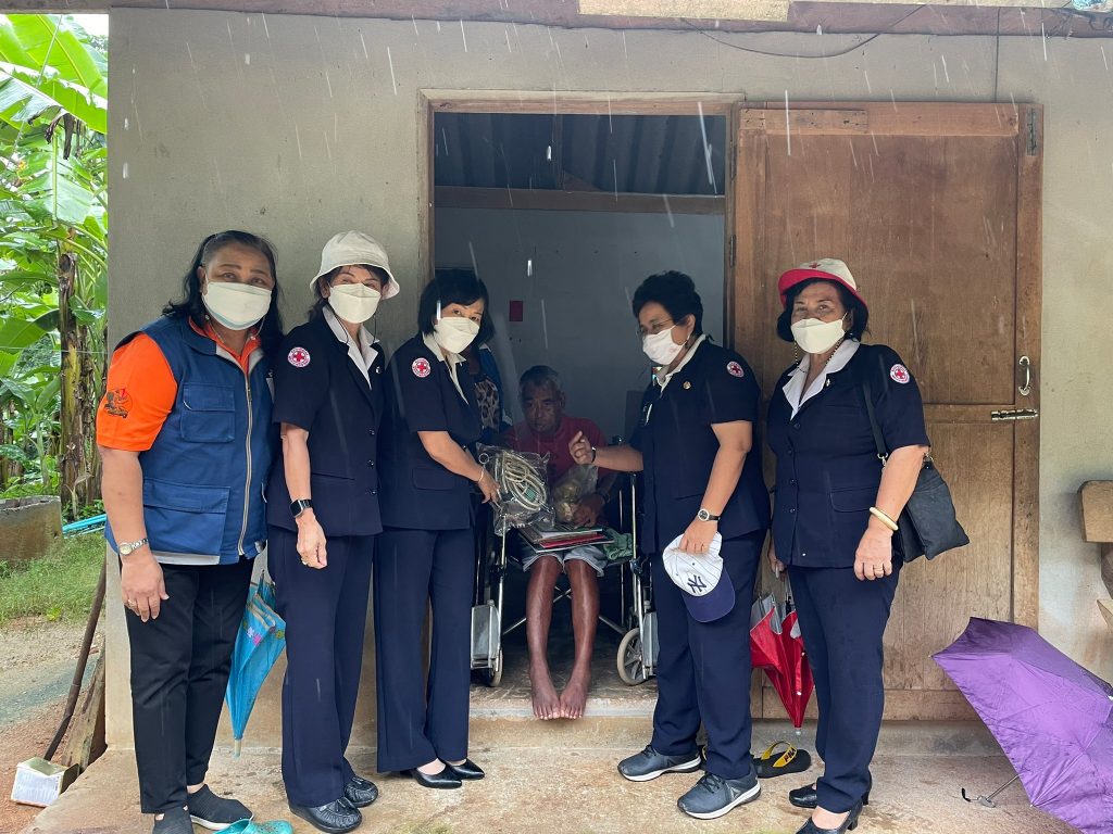 ในการนี้ เหล่ากาชาดจังหวัดตรังมอบผ้าอ้อมสำเร็จรูป แผ่นรองซับ และเชือกกายภาพ เพื่อช่วยเหลือในเบื้องต้น