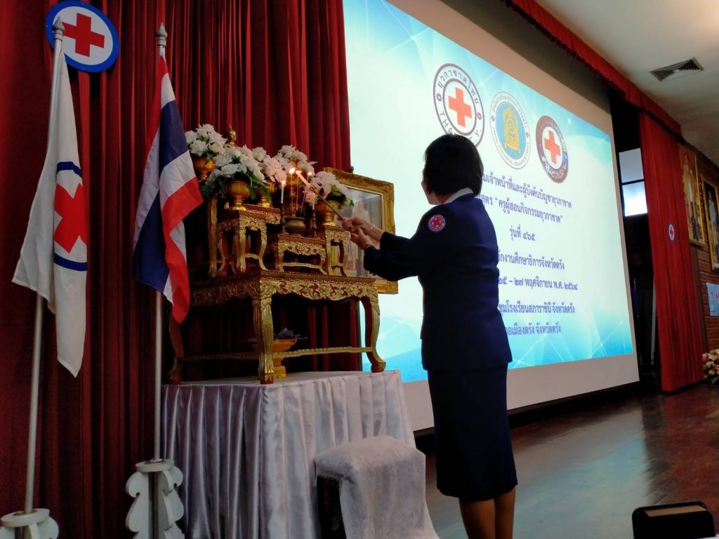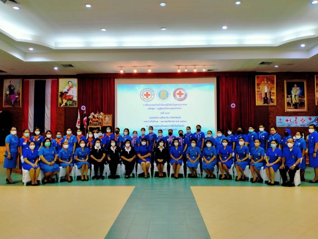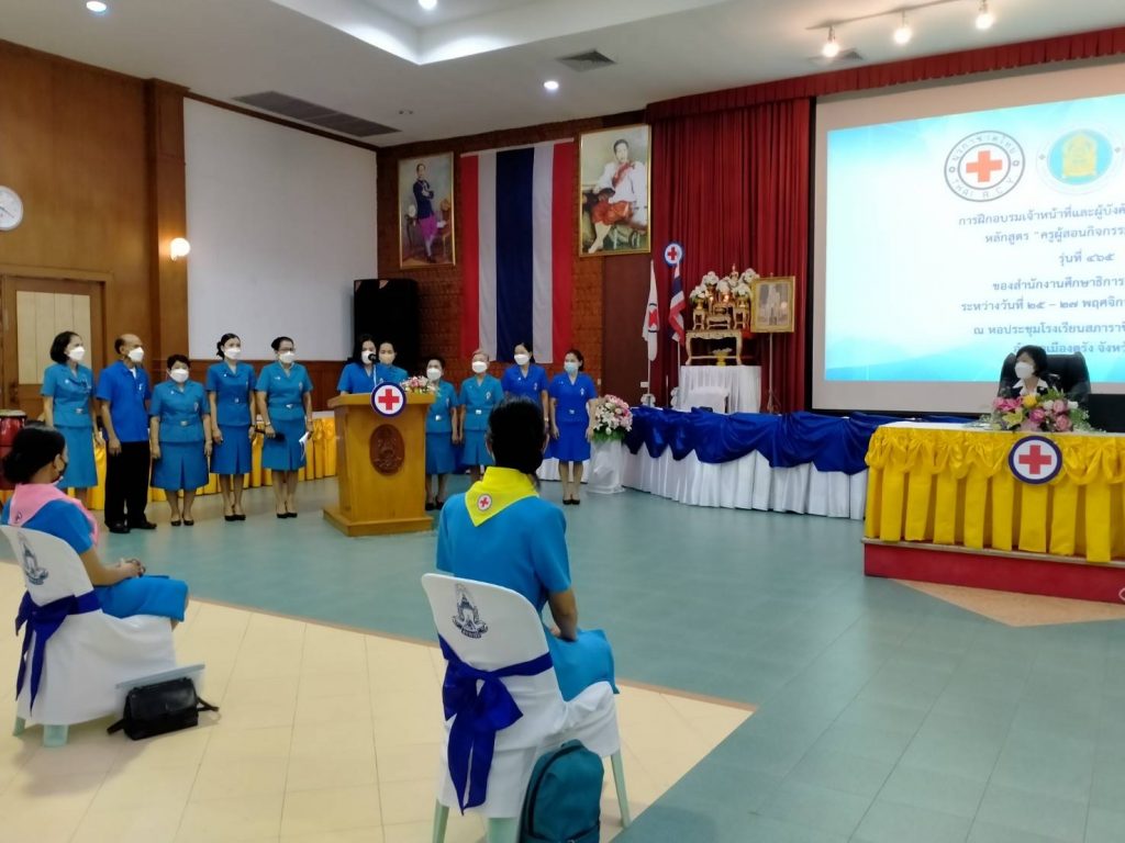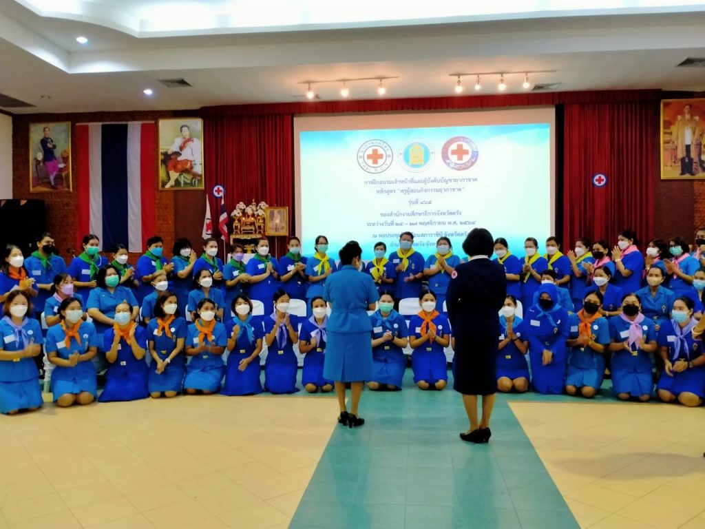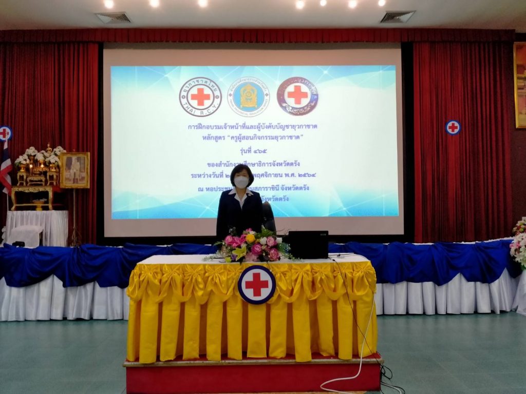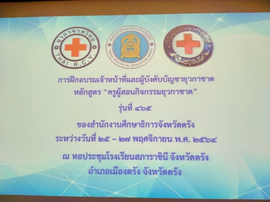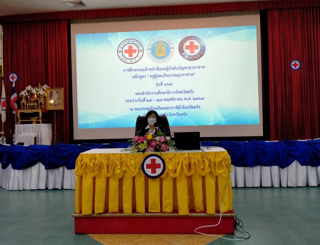 วันที่ 25 พฤศจิกายน 2564 ที่ห้องประชุมโรงเรียนสภาราชินี จังหวัดตรัง นางละมัย เจริญโสภา นายกเหล่ากาชาดจังหวัดตรัง มอบหมายนางลักษณาพร อนันต์วรปัญญา รองนายกเหล่ากาชาดจังหวัดตรัง เป็นประธานในพิธีเปิดการอบรมโครงการอบรมเจ้าหน้าที่และผู้บังคับบัญชายุวกาชาด หลักสูตรครูผู้สอนกิจกรรยุวกาชาด รุ่นที่ 465 ระหว่างวันที่ 25-27 พฤศจิกายน 2564 โดยมีอาจารย์ปิยพรรณ กาฬวงศ์ วิทยากรแกนนำยุวกาชาด สภากาชาดไทย เป็นผู้อำนวยการฝึก