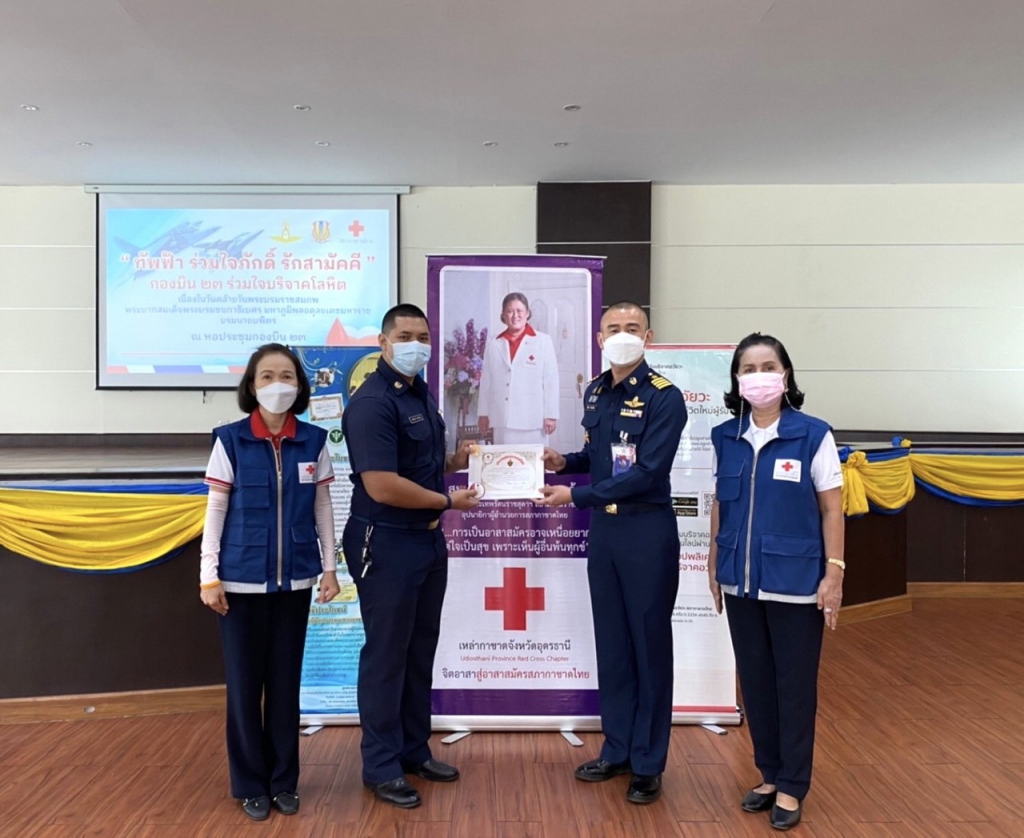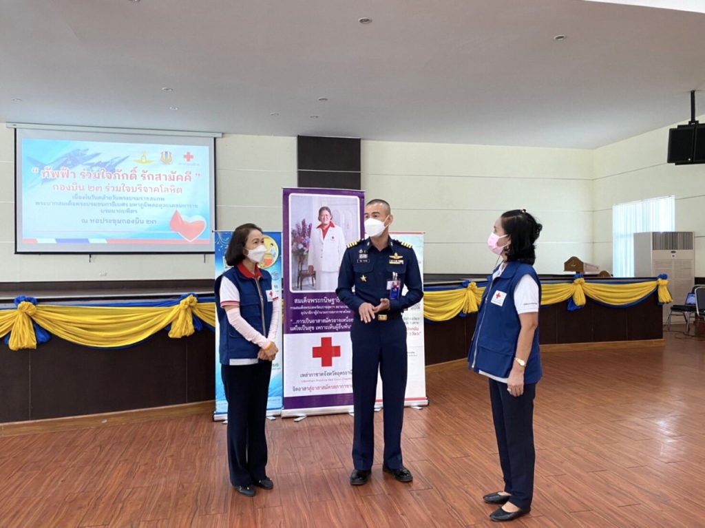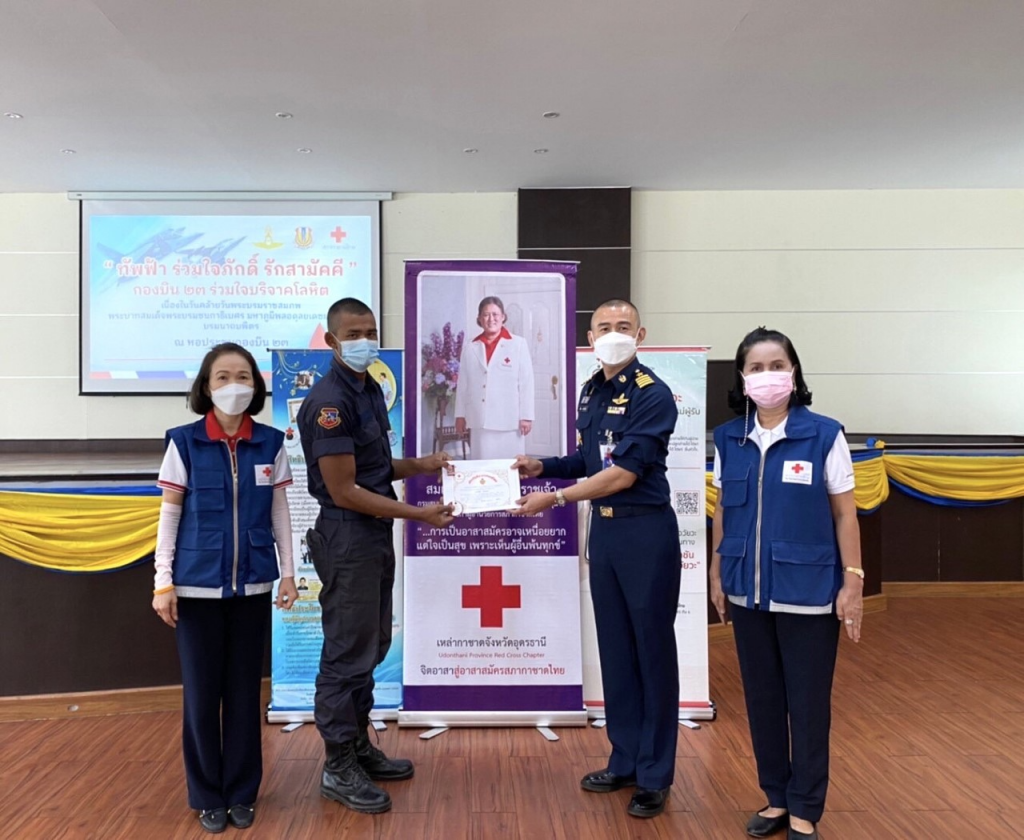 วันที่ 1 ธันวาคม 2564 นายสยาม ศิริมงคล นายกเหล่ากาชาดจังหวัดอุดรธานี/ผู้ว่าราชการจังหวัดอุดรธานี มอบหมายให้กรรมการและเจ้าหน้าที่เหล่ากาชาดจังหวัดอุดรธานี ออกหน่วยรับบริจาคโลหิตเคลื่อนที่ร่วมโรงพยาบาลอุดรธานี เพื่อเป็นกำลังใจให้เจ้าหน้าที่และผู้บริจาคโลหิต ในการนี้ นาวาอากาศเอก วิศรุต จันทประดิษฐ์ ผู้บังคับการกองบิน 23 อุดรธานี มอบหมาย นาวาอากาศเอก นิโรธ จำปาเงิน รองผู้บังคับการกองบิน 23 อุดรธานี พร้อมด้วยกำลังพลนายทหาร นายสิบ พลทหารและครอบครัว ทหาร ได้เข้าร่วมกิจกรรมการบริจาคโลหิต ทั้งนี้ มีผู้แสดงความจำนงบริจาคอวัยวะ 20 ราย ดวงตา 20 ราย บริจาคโลหิต 179 ราย ผ่านการคัดกรอง 156 ราย รวมปริมาณโลหิตที่ได้จำนวน 70,200 ซีซี. ณ กองบิน 23 อุดรธานีอำเภอเมืองอุดรธานี จังหวัดอุดรธานี