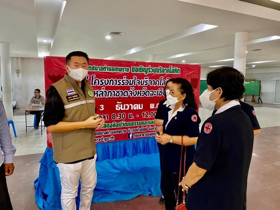 วันที่ 3 ธันวาคม 2564 นางจันทรรัตน์ ไตรติลานันท์ นายกเหล่ากาชาดจังหวัดฉะเชิงเทรา มอบคณะกรรมการเหล่ากาชาดจังหวัดฉะเชิงเทรา เยี่ยมให้กำลังใจผู้บริจาคโลหิต โดยมีผู้ร่วมบริจาคโลหิตมากกว่า 53 ราย ณ หอประชุมสำนักงานเทศบาลตำบลเทพราช อำเภอบ้านโพธิ์ จังหวัดฉะเชิงเทรา