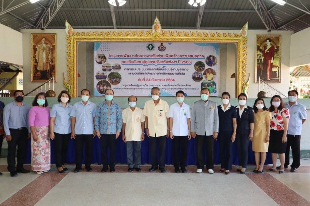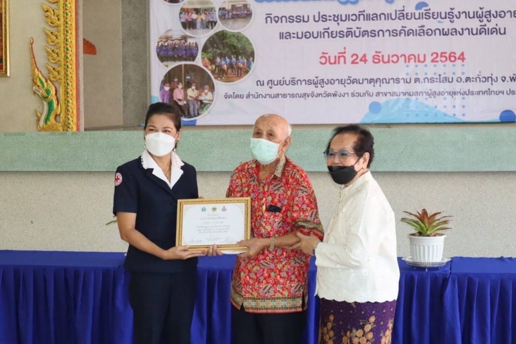 วันที่ 24 ธันวาคม 2564 นางวิภาดา ทิพญพงศ์ธาดา นายกเหล่ากาชาดจังหวัดพังงา มอบหมายให้นางจีรนันท์ สุทพัฒน์แก้ว รองนายกเหล่ากาชาดจังหวัดพังงา พร้อมด้วยกรรมการเหล่ากาชาดจังหวัดพังงา ร่วมโครงการพัฒนาศักยภาพเครือข่าย เพื่อสร้างความเสมอภาครองรับสังคมผู้สูงอายุจังหวัดพังงา พร้อมทั้ง มอบเกียรติบัตร ให้แก่ นายบัญฑูร นิจผล และ นางบุบผา นิจผล คู่แก้ว-คู่ขวัญ ระดับจังหวัดพังงา ณ ศูนย์บริการผู้สูงอายุ วัดมาตุคุณาราม ตำบลกระโสม อำเภอตะกั่วทุ่ง จังหวัดพังงา