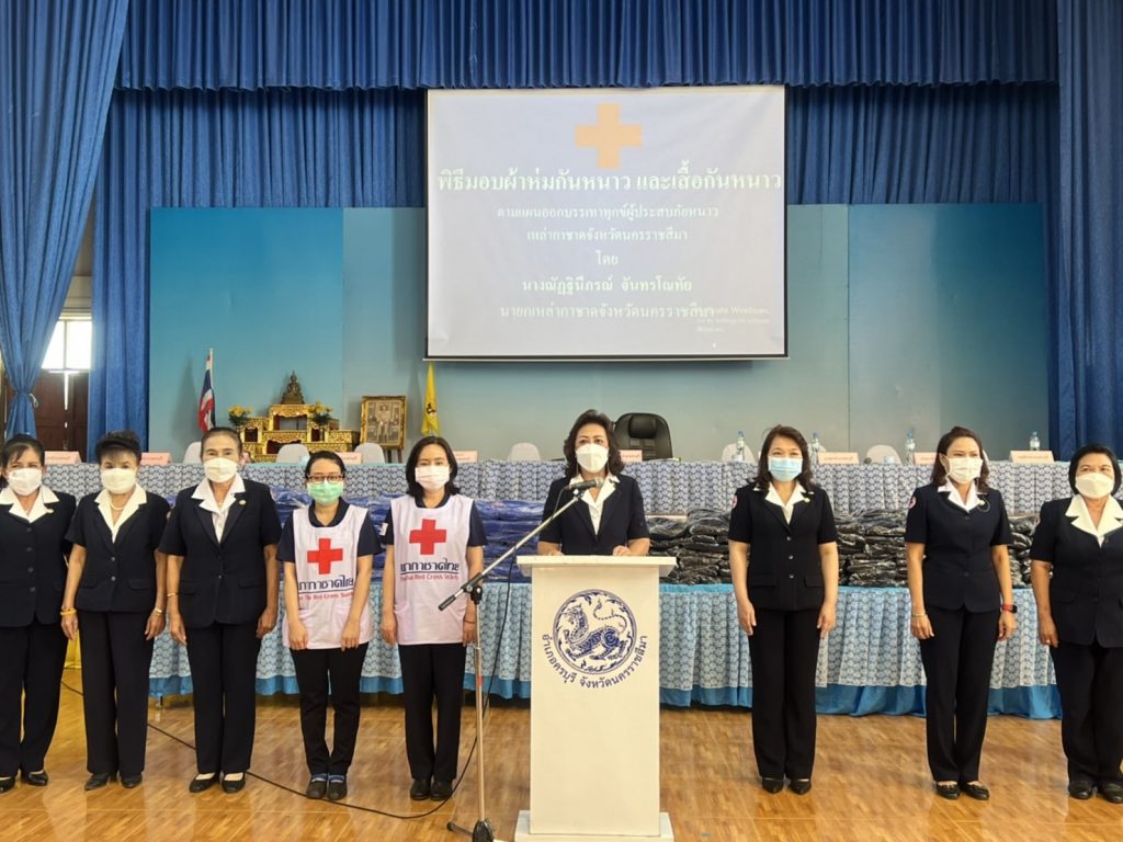 วันที่ 30 ธันวาคม 2564 นางณัฏฐินีภรณ์ จันทรโณทัย นายกเหล่ากาชาดจังหวัดนครราชสีมา พร้อมด้วย สถานีกาชาดที่ 4 คณะกรรมการและสมาชิกเหล่ากาชาดจังหวัดนครราชสีมา ลงพื้นที่มอบผ้าห่ม จำนวน 100 ผืน และ เสื้อกันหนาว จำนวน 200 ตัว ให้แก่ประชาชนผู้ประสบภัยหนาวในพื้นที่อำเภอครบุรี ณ หอประชุมอำเภอครบุรี อ.ครบุรี จ.นครราชสีมา