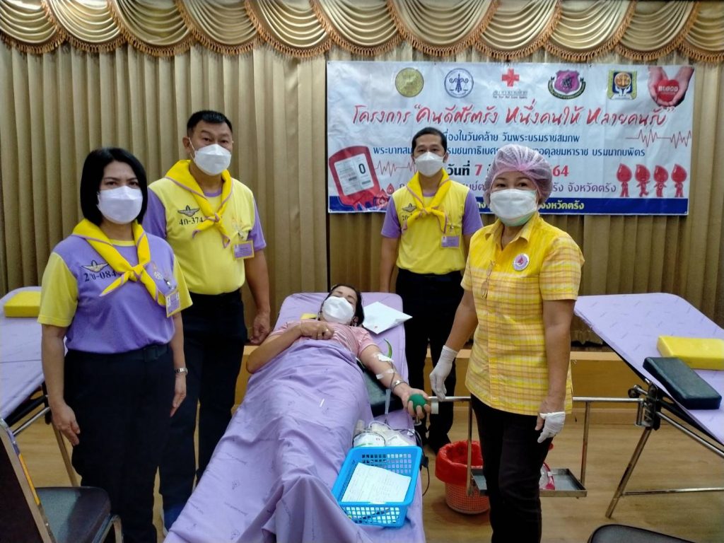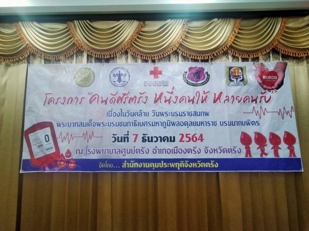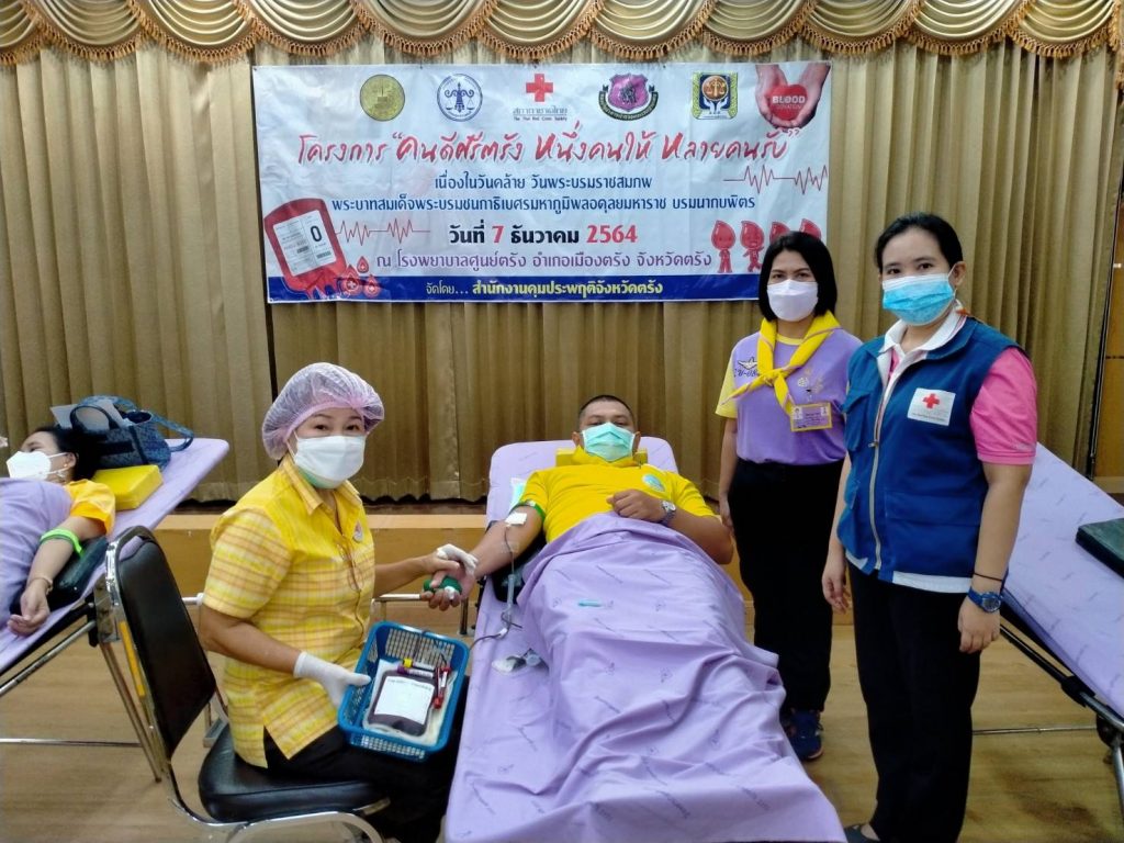 วันที่ 7 ธันวาคม 2564 นางละมัย เจริญโสภา นายกเหล่ากาชาดจังหวัดตรัง มอบหมายคณะกรรมการเหล่ากาชาด สมาชิก และเจ้าหน้าที่ ร่วมกับธนาคารเลือดโรงพยาบาลตรัง ออกหน่วยรับบริจาคโลหิต ณ ห้องประชุม ชั้น 2 โรงพยาบาลตรัง โดยมีสำนักงานคุมประพฤติร่วมกับโรงพยาบาลตรังโครงการ “คนดีศรีตรัง หนึ่งคนให้ หลายคนรับ”เนื่องในวันคล้ายวันพระราชสมภพพระบาทสมเด็จพระบรมชนกาธิเบศรมหาภูมิพลอดุลยเดชมหาราช บรมนาถบพิตร มีผู้บริจาคทั้งหมด 70 ราย ได้โลหิต 39 ยูนิต คิดเป็นปริมาณ 15,600 ซีซี. ผู้รับเข็มที่ระลึกบริจาคโลหิต 7 ครั้ง 1 ราย และ 36 ครั้ง 2 ราย พร้อมมอบหน้ากากอนามัยกับสายคล้องคอ 40 ชิ้น