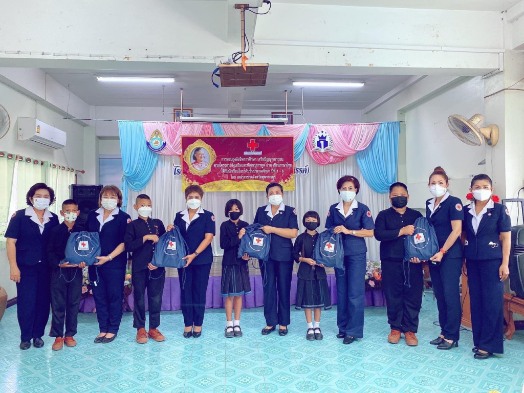 วันที่ 4 กุมภาพันธ์ 2565 นางนภัสสร สุวรรณประทีป นายกเหล่ากาชาดจังหวัดสุพรรณบุรี นางอัจฉราภรณ์ ถนอมกิตติ ที่ปรึกษาเหล่ากาชาดจังหวัด พร้อมด้วยกรรมการและสมาชิกเหล่ากาชาดจังหวัด ร่วมมอบถุงยังชีพการศึกษา เสริมปัญญาเยาวชน ตามโครงการส่งเสริมและพัฒนาการพูด อ่าน เขียนภาษาไทย ให้กับนักเรียนระดับประถมต้น ป.1 – ป.3 จำนวน 5 ราย และนักเรียนระดับประถมปลาย ป.4 – ป.6 จำนวน 5 ราย ณ โรงเรียนวัดดอนมะเกลือ (นันทราษฎร์รังสรรค์) อ.อู่ทอง จ.สุพรรณบุรี