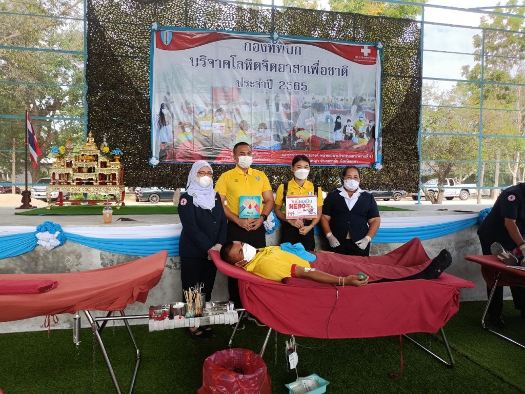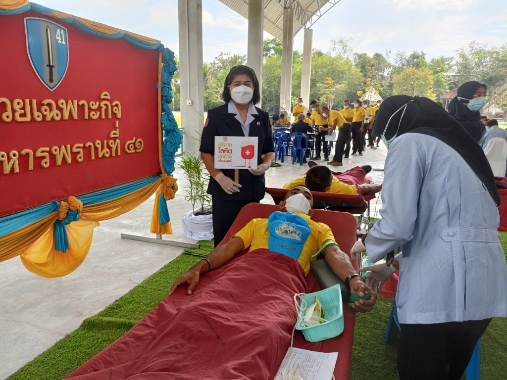 วันที่ 27 มกราคม 2565 ผศ.ดร.ทิพยวรรณ นิลทยา นายกเหล่ากาชาดจังหวัดยะลา มอบหมายให้คณะกรรมการและสมาชิกเหล่ากาชาดจังหวัดยะลา ร่วมกับโรงพยาบาลยะลาออกหน่วยรับบริจาคโลหิตตามโครงการ Plus 1 เพิ่มจำนวนครั้ง เพิ่มโลหิต เพิ่มชีวิต (Plus One Blood Donation, More Blood More Live) ณ กรมทหารพรานที่ 41 ต.วังพญา อ.รามัน จ.ยะลา มีผู้เข้าร่วมแสดงความจำนงบริจาคโลหิต จำนวน 80 ราย ผ่านการคัดกรองและสามารถบริจาคโลหิตได้ จำนวน 78 ราย ได้โลหิต 35,100 ซีซี ในโอกาสนี้เหล่ากาชาดจังหวัดยะลาขอขอบคุณ ผู้บังคับการกรมทหารพรานที่ 41 ผู้เกี่ยวข้องและผู้ร่วมบริจาคโลหิตทุกท่านที่มีส่วนร่วมการสนับสนุนการรับบริจาคโลหิตในครั้งนี้