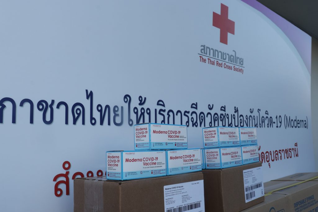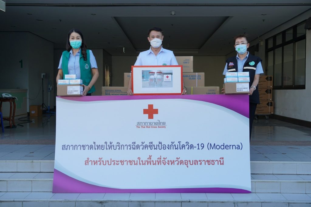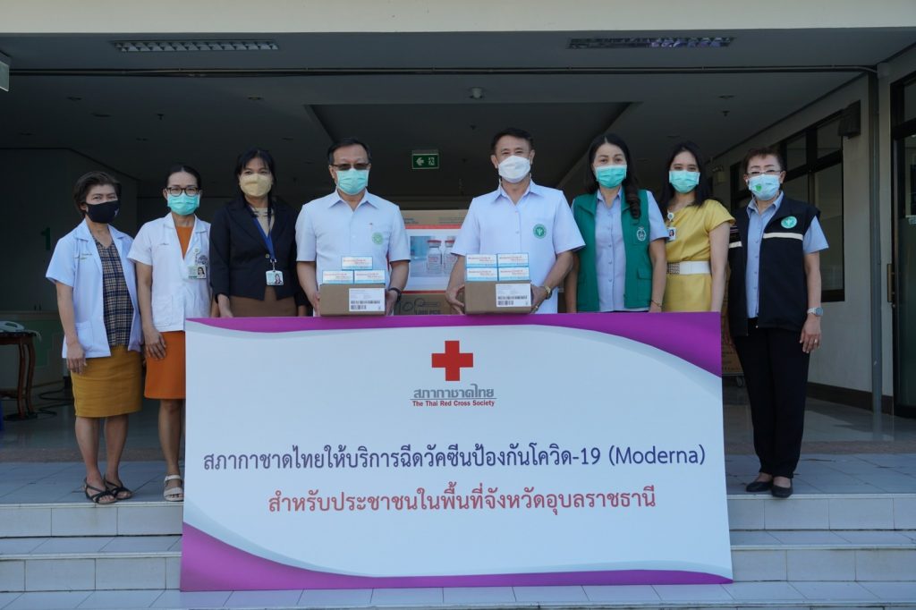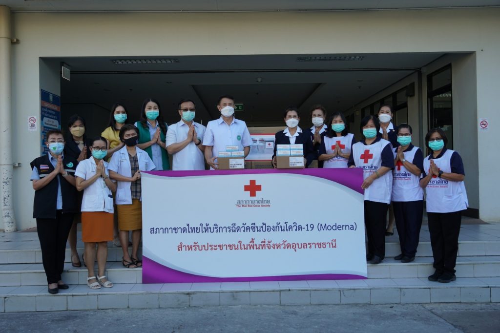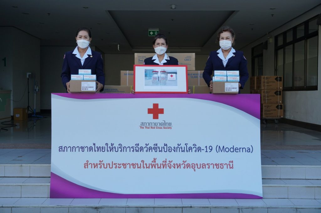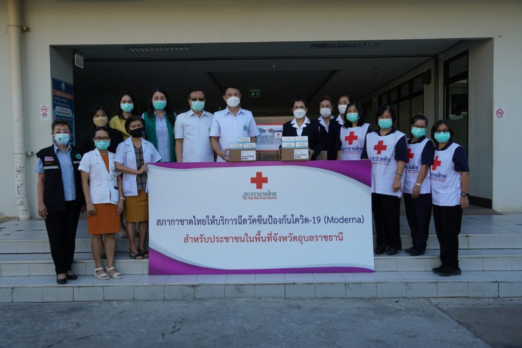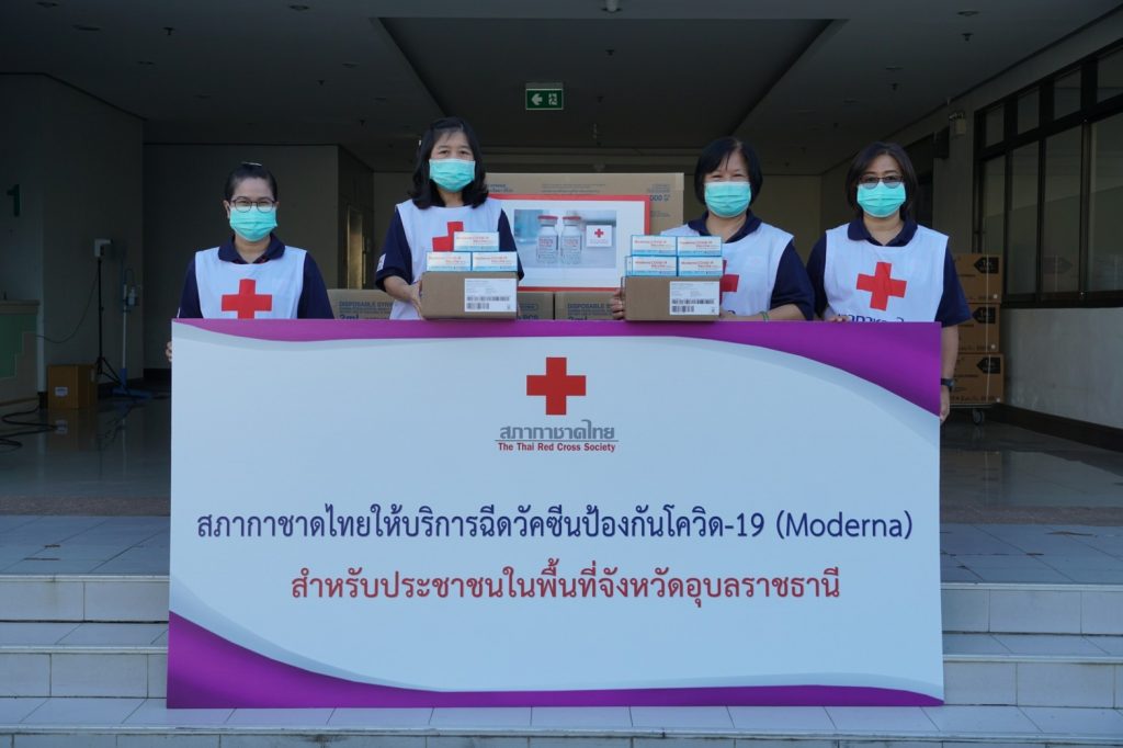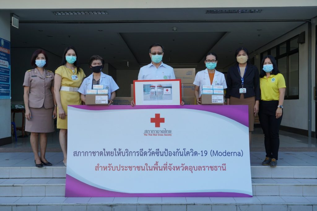วันที่ 20 ธันวาคม 25 64 นางศลิษา ภิรมย์รัตน์ นายกเหล่ากาชาดจังหวัดอุบลราชธานี กรรมการสภากาชาดไทยผู้แทนภาค 7 เป็นตัวแทนสภากาชาดไทย พร้อมด้วยคณะกรรมการเหล่ากาชาดจังหวัดอุบลราชธานี สมาชิกเหล่ากาชาดจังหวัดอุบลราชธานี และนางธัญธรณ์ วิทยาขาว หัวหน้าสถานีกาชาดที่ 7 จังหวัดอุบลราชธานี เจ้าหน้าที่สถานีกาชาดที่ 7 จังหวัดอุบลราชธานี มอบวัคซีนป้องกันโรคโควิด 19 Moderna ให้กับจังหวัดอุบลราชธานี โดยมีนายแพทย์สุวิทย์ โรจนศักดิ์โสธร นายแพทย์สาธารณสุขจังหวัดอุบลราชธานี นายแพทย์มนต์ชัย วิวัฒนาสิทธิพงศ์ ผู้อำนวยการโรงพยาบาลสรรสิทธิ์ประสงค์ จังหวัดอุบลราชธานี เป็นผู้รับมอบวัคซีนฯ เพื่อนำไปฉีดให้กลุ่มเป้าหมาย 5 กลุ่ม ได้แก่