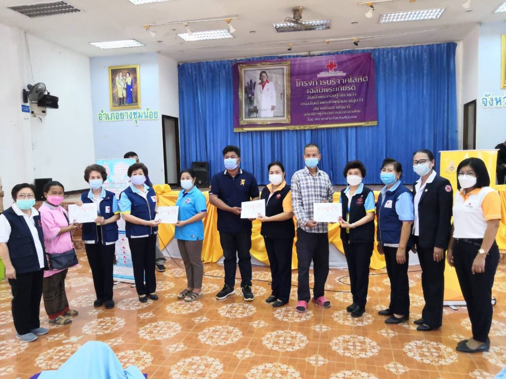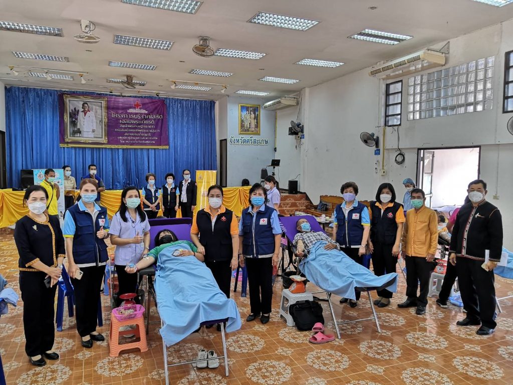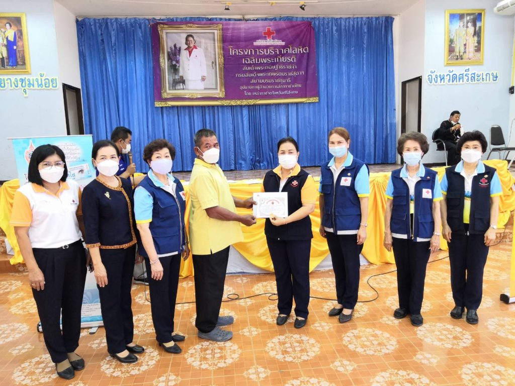 วันที่ 8 กุมภาพันธ์ 2565 นางมัลลิกา พุฒิชาติ นายกเหล่ากาชาดจังหวัดศรีสะเกษ มอบหมายให้นางสมยา ศรีขาว รองนายกเหล่ากาชาดจังหวัดศรีสะเกษ พร้อมด้วยกรรมการ สมาชิก (กลุ่ม 2 คุณแม่อาหม่วย) และเจ้าหน้าที่เหล่ากาชาดจังหวัดศรีสะเกษ ออกหน่วยรับบริจาคโลหิต ร่วมกับ ธนาคารเลือด โรงพยาบาลศรีสะเกษ ที่ทำการปกครองอำเภอยางชุมน้อย สำนักงานสาธารณสุขอำเภอยางชุมน้อย โรงพยาบาลส่งเสริมสุขภาพตำบลในพื้นที่อำเภอยางชุมน้อย ณ หอประชุมอำเภอยางชุมน้อย จังหวัดศรีสะเกษ มีผู้แสดงความประสงค์บริจาคโลหิต จำนวน 199 ราย ผู้บริจาคโลหิตได้จริง จำนวน 180 ราย ปริมาณโลหิตที่ได้ จำนวน 180 ยูนิต ผู้ได้รับเข็มบริจาคโลหิต ครบ 7 ครั้ง จำนวน 7 ราย ครบ 16 ครั้ง จำนวน 3 ราย และครบ 24 ครั้ง จำนวน 2 ราย พร้อมนี้ เหล่ากาชาดจังหวัดศรีสะเกษ ได้นำนม ขนม และชุดกิ๊ฟเซ็ตป้องกันโควิด-19 จำนวน 100 ชุด ประกอบด้วย เจลเเอลกอฮอล์ หน้ากากอนามัย มอบให้ผู้บริจาคโลหิตเพื่อใช้ในการป้องกันตนเองภายใต้สถานการณ์การแพร่ระบาดของโรคติดเชื้อไวรัสโคโรนา 2019 (COVID-19) โดยมีนายธรรมศักดิ์ สว่างวงษ์ ปลัดอำเภอหัวหน้ากลุ่มงานบริหารงานปกครอง รักษาราชการแทนนายอำเภอยางชุมน้อย ให้การต้อนรับ พร้อมนำ ปลัดอำเภอ สาธารณสุขอำเภอ เสมียนตราอำเภอ หัวหน้าส่วนราชการ ผู้บริหารองค์กรปกครองส่วนท้องถิ่น ผู้บริหารสถานศึกษา ข้าราชการ เจ้าหน้าที่ กำนัน ผู้ใหญ่บ้าน อาสาสมัครสาธารณสุขประจำหมู่บ้าน(อสม.) นักเรียน นักศึกษา และประชาชนในพื้นที่ร่วมกิจกรรมการบริจาคโลหิตในครั้งนี้ ทั้งนี้ ได้ถือปฏิบัติตามมาตรการป้องกันการแพร่ระบาดของโรคติดเชื้อไวรัสโคโรนา 2019 (COVID -19) อย่างเคร่งครัด
