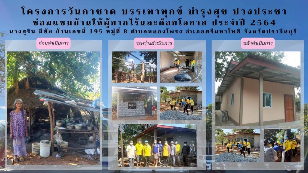 วันที่ 26 มกราคม 2565 นายวรพันธุ์ สุวัณณุสส์ ผู้ว่าราชการจังหวัดปราจีนบุรี พร้อมด้วยนางมัทนา สุวัณณุสส์ นายกเหล่ากาชาดจังหวัดปราจีนบุรี นายพงษ์สิทธิ์ เนื่องจำนงค์ รองผู้ว่าราชการจังหวัดปราจีนบุรี พ.ต.ท.หญิง สุมน เนื่องจำนงค์ รองนายกเหล่ากาชาดจังหวัดปราจีนบุรี นายชัยวรรณ นิยม นายอำเภอศรีมหาโพธิ ที่ปรึกษา คณะกรรมการและสมาชิกเหล่ากาชาดจังหวัดปราจีนบุรี หัวหน้าส่วนราชการ ผู้นำท้องที่ ท้องถิ่น และจิตอาสาพระราชทาน ร่วมในพิธีมอบบ้านตามโครงการ “วันกาชาด บรรเทาทุกข์ บำรุงสุข ปวงประชา” สร้างบ้านให้ผู้ยากไร้และด้อยโอกาส ประจำปี 2564 ที่ได้รับการสนับสนุนจากงบประมาณเหล่ากาชาดจังหวัดปราจีนบุรี จำนวน 120,000 บาท ให้แก่ครอบครัว นางสุริน มีชัย บ้านเลขที่ 195 หมู่ 8 ตำบลหนองโพรง อำเภอศรีมหาโพธิ จังหวัดปราจีนบุรี พร้อมนี้ เหล่ากาชาดจังหวัดปราจีนบุรี ได้มอบ